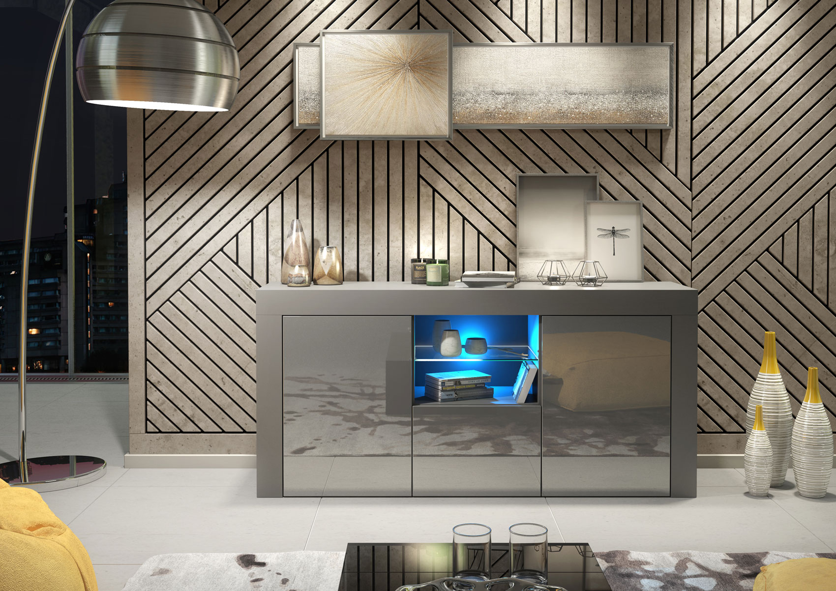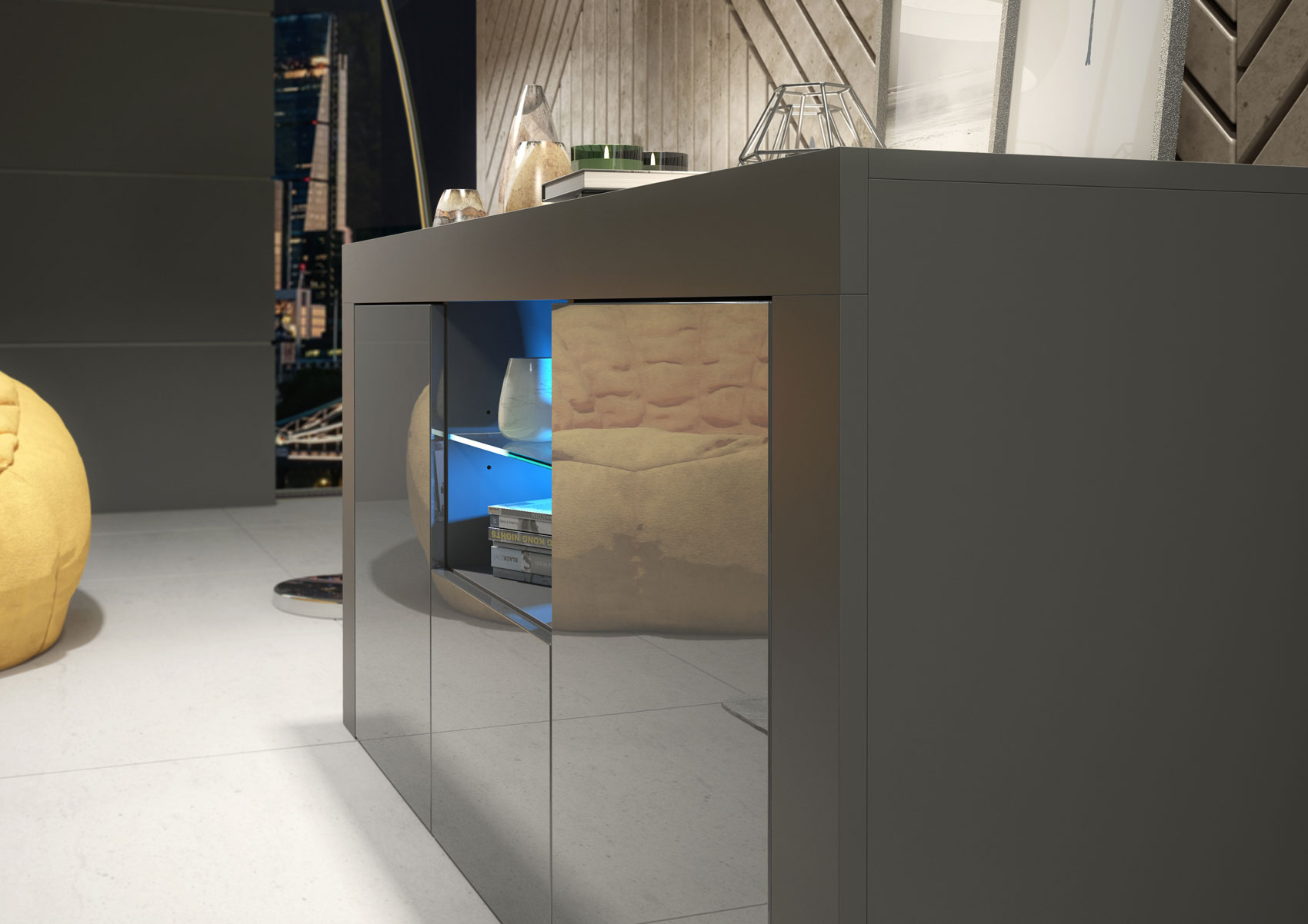 Style with layered grey tones, soft textiles, and warm ambient lighting to enhance the gloss contrast and create a calm, modern living space with a designer finish.