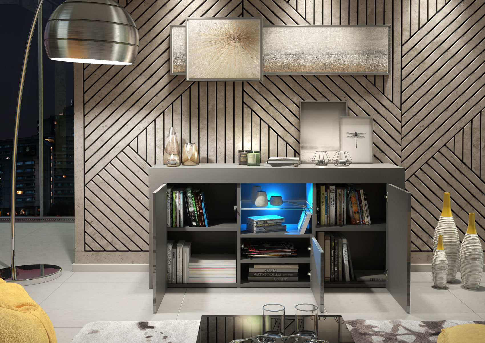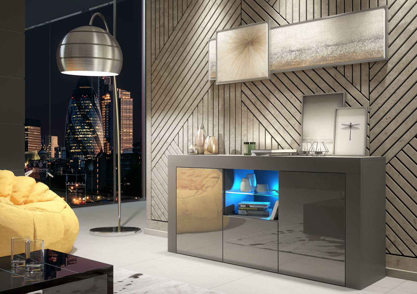 Finished in a grey matt body combined with elegant grey high-gloss doors, this TV unit sideboard creates a layered, contemporary look that reflects light without overpowering the space. Crafted from durable MDF and chipboard, the construction ensures stability and reliability for everyday living while maintaining a clean, streamlined silhouette.