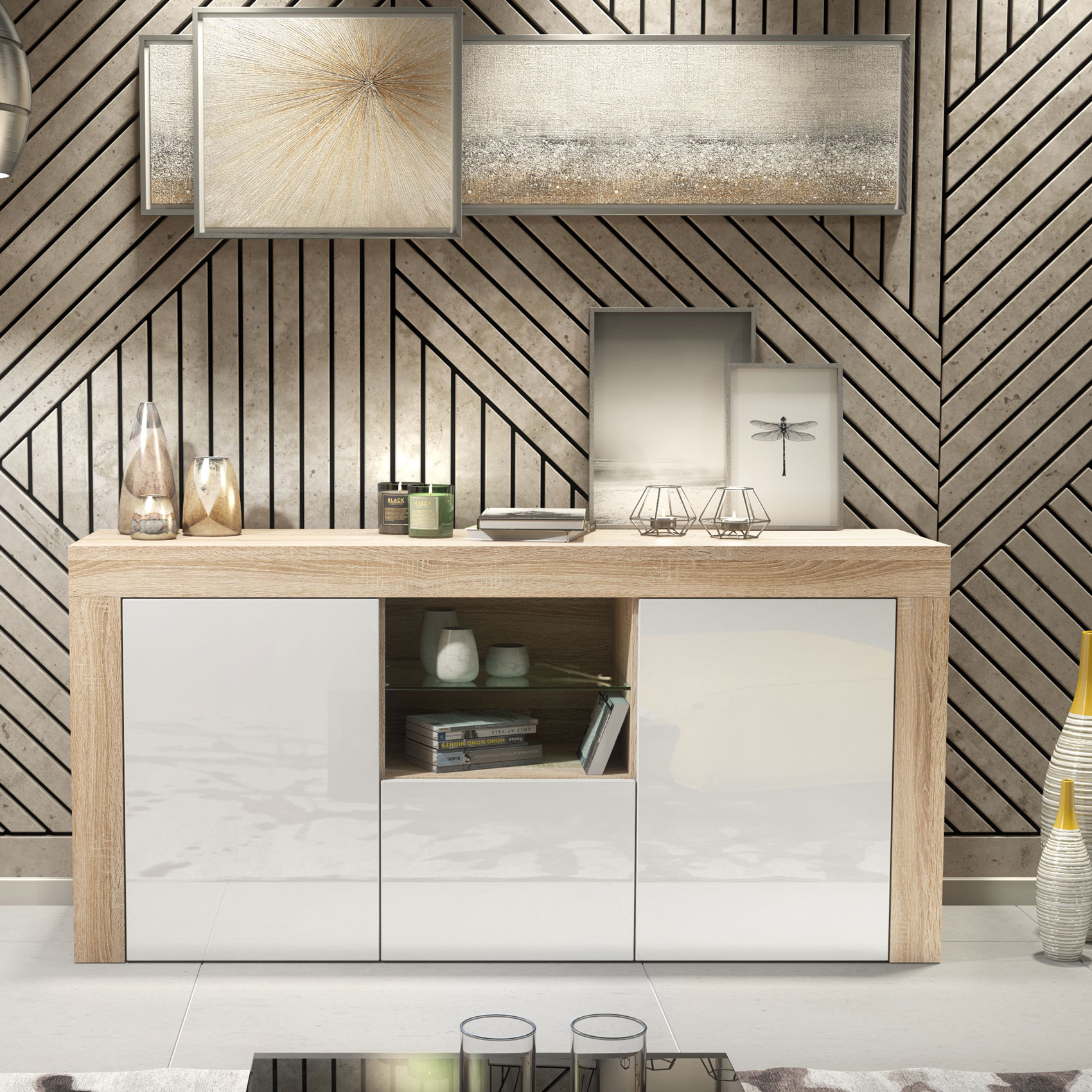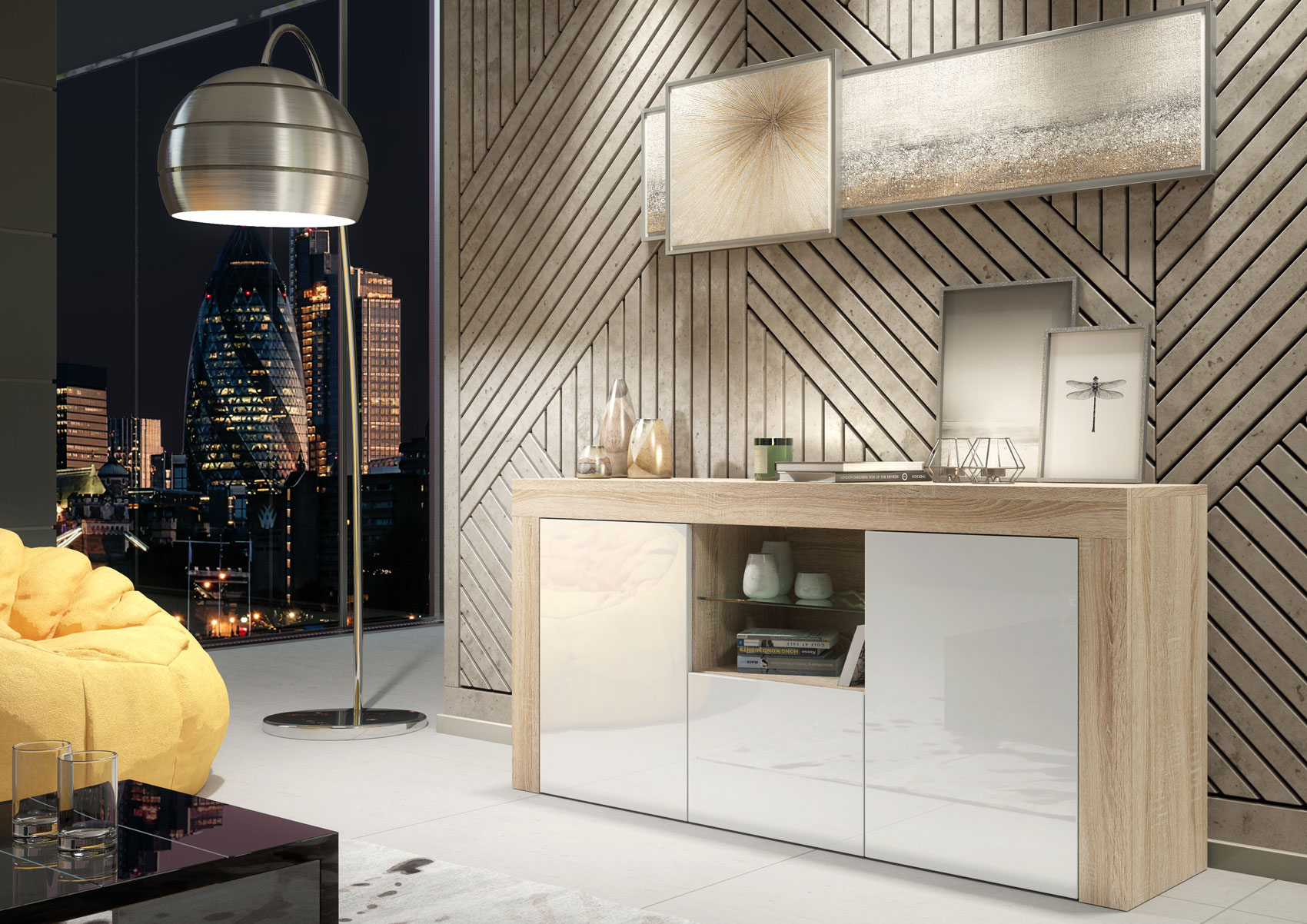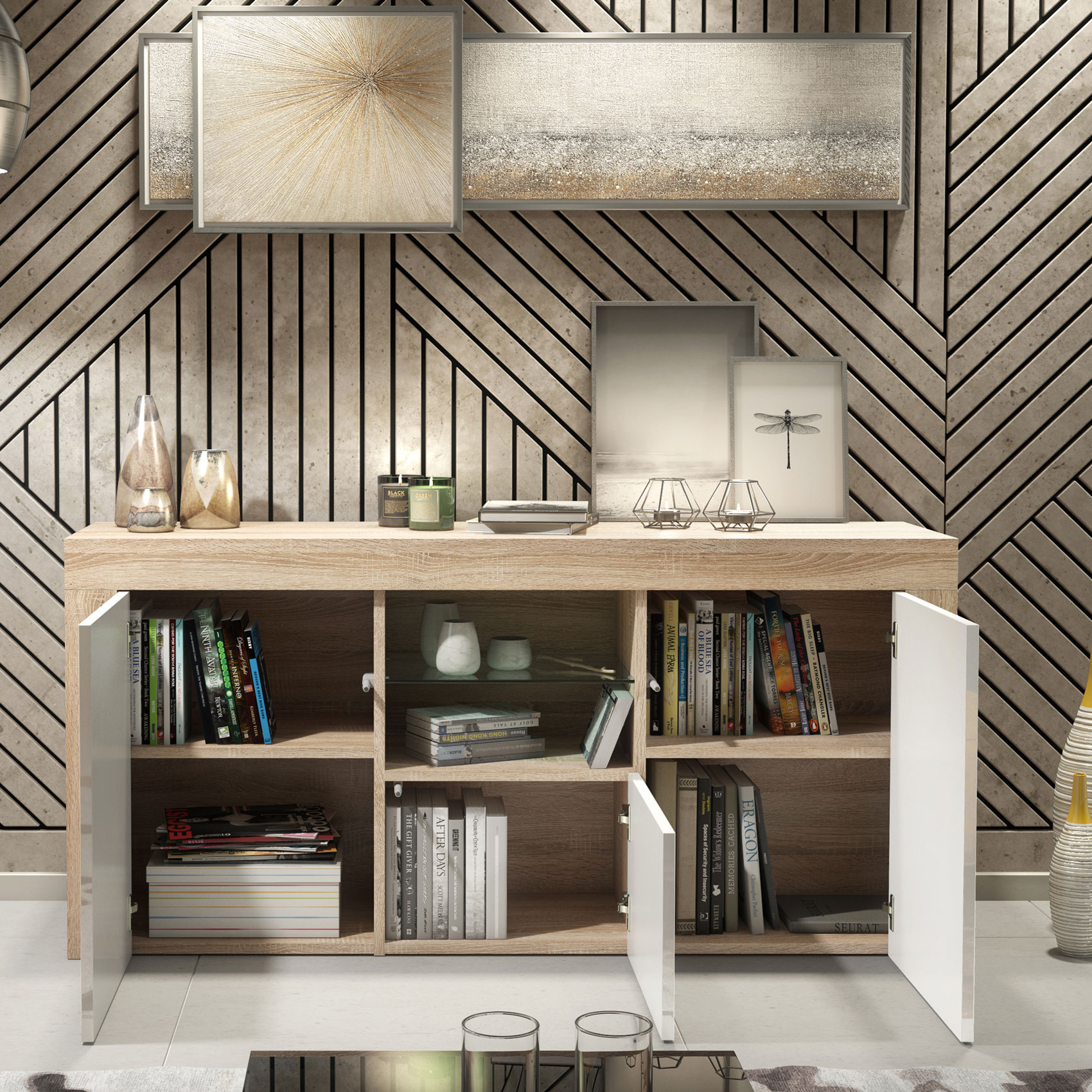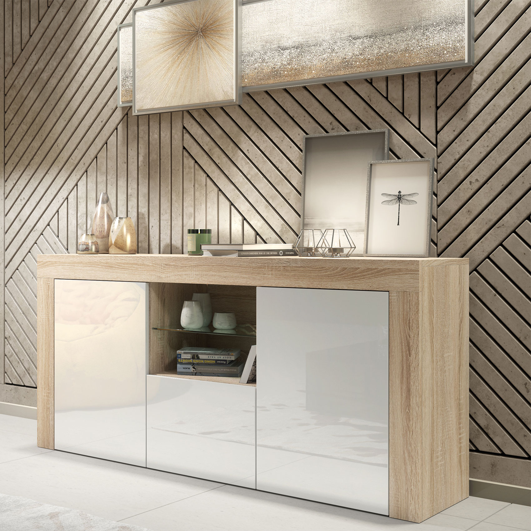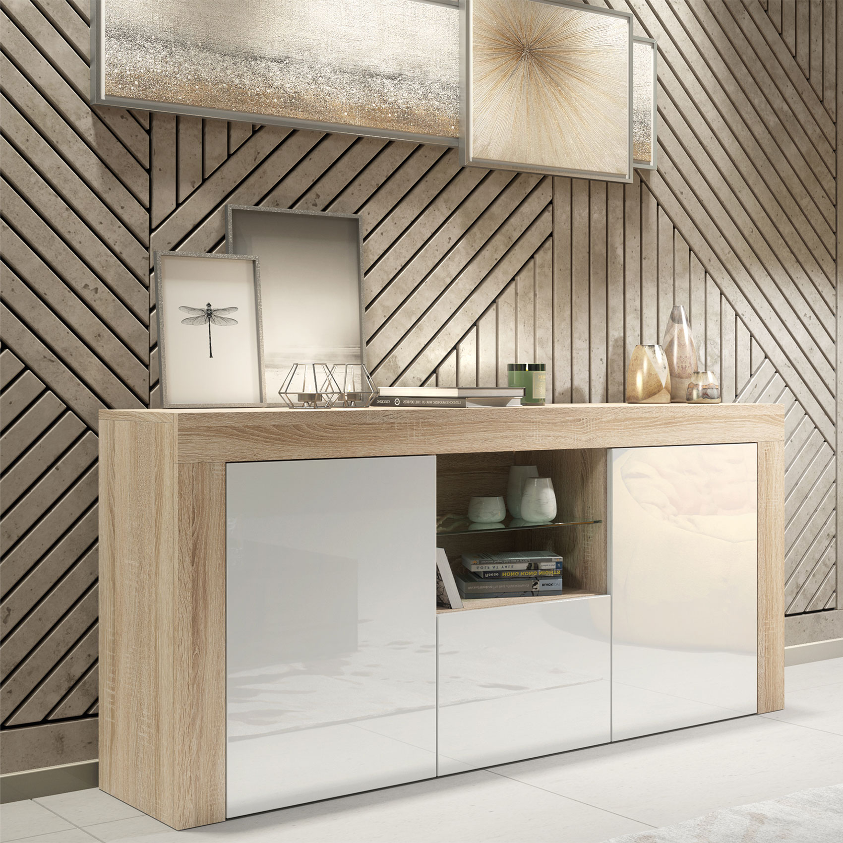 Finished in a matt oak body paired with white high-gloss doors, this TV unit sideboard brings warmth and contrast to contemporary interiors while maintaining a clean, minimalist silhouette. Crafted from durable MDF and chipboard, the construction ensures stability and reliability for daily use while preserving a refined, modern profile.