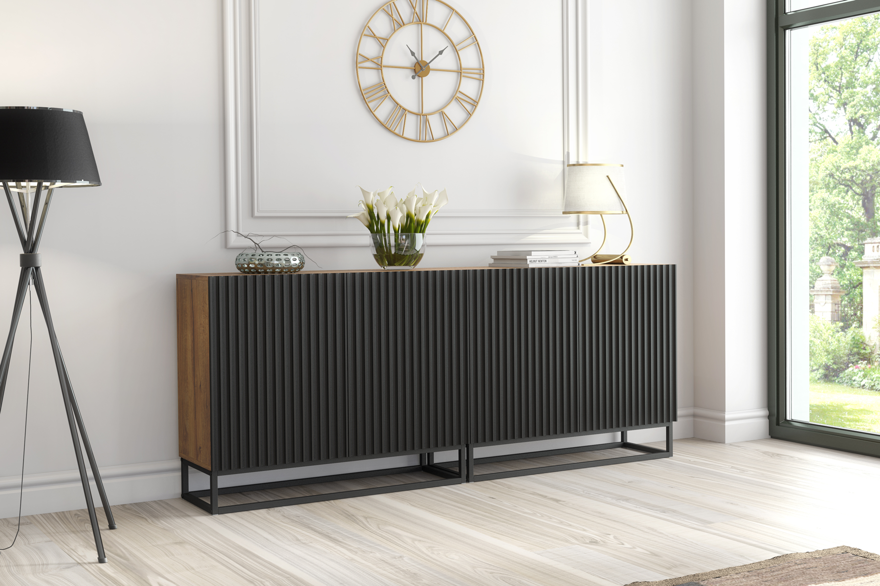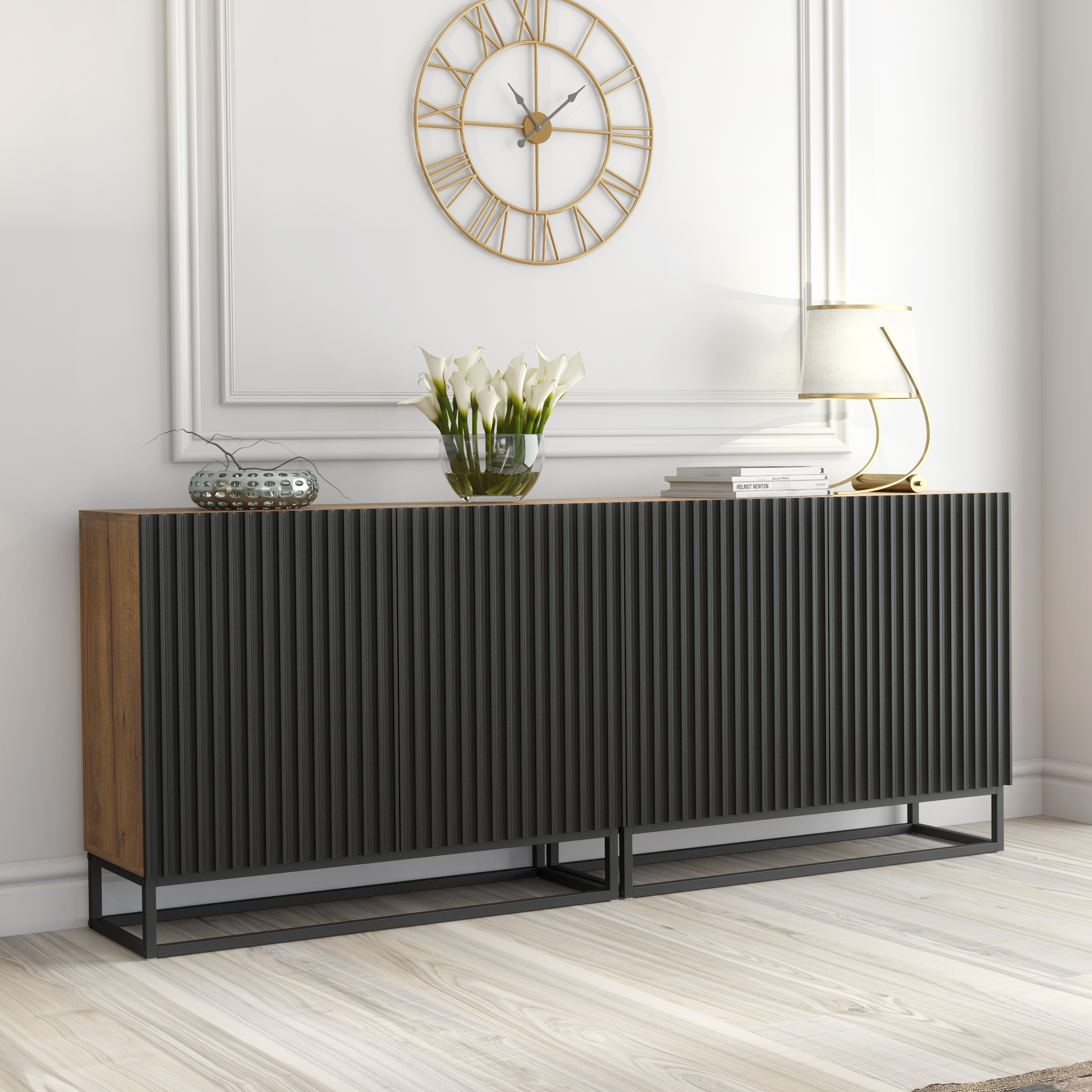 Luxury 200cm Oak & Black Fluted Sideboard — Designer Double Modular Storage Cabinet on Steel Frame