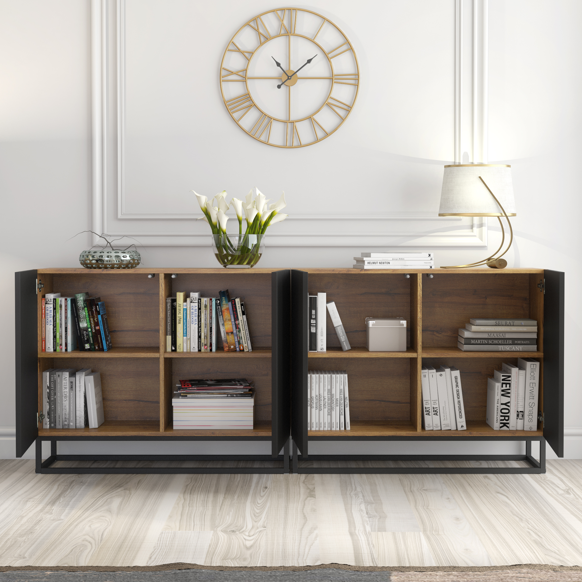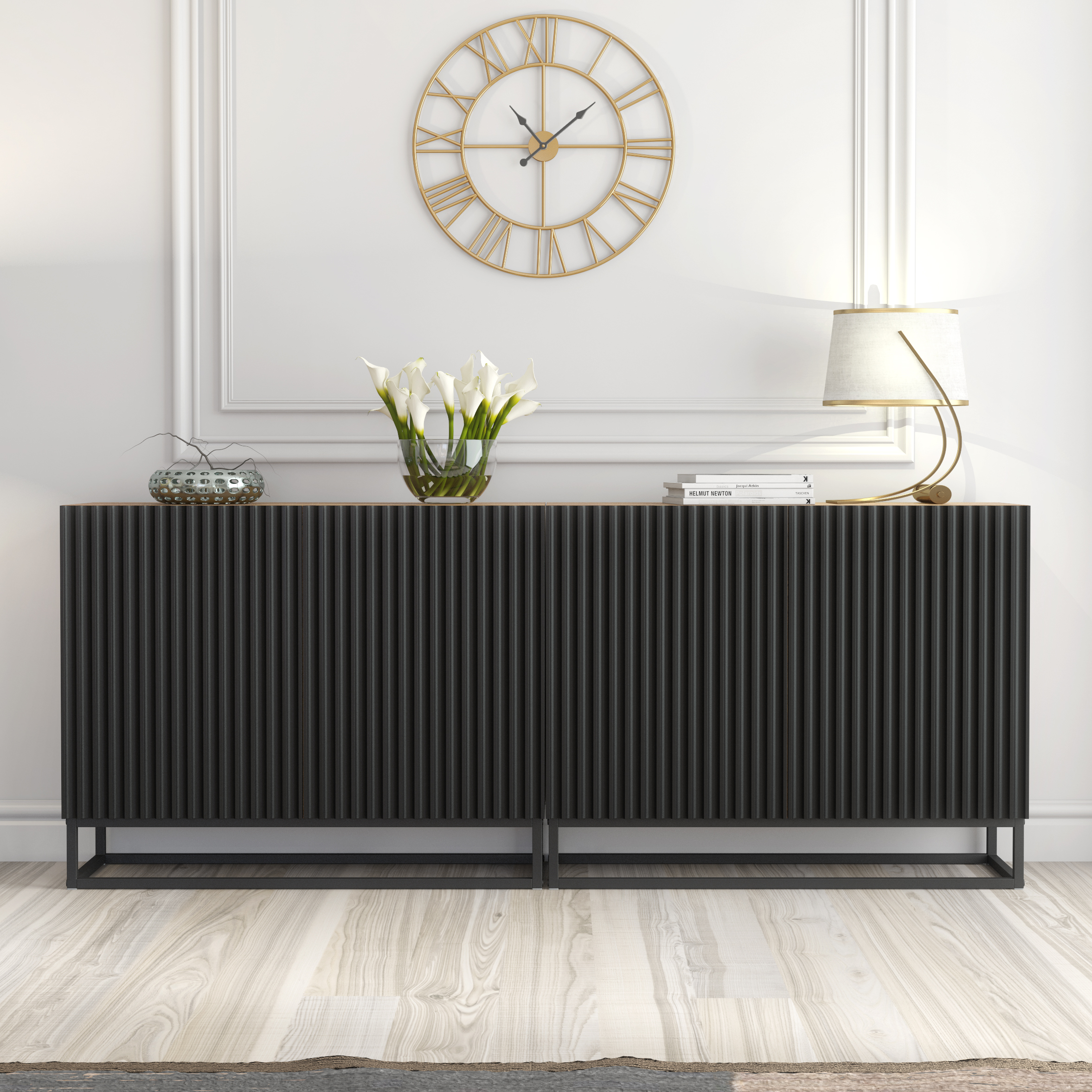 Behind the four soft-opening fluted doors, you’ll find generous internal shelving across both modules, offering ample space for tableware, books, decorative objects, documents, or everyday essentials. The concealed storage keeps your space organised while preserving the clean, minimalist aesthetic that defines modern luxury living.