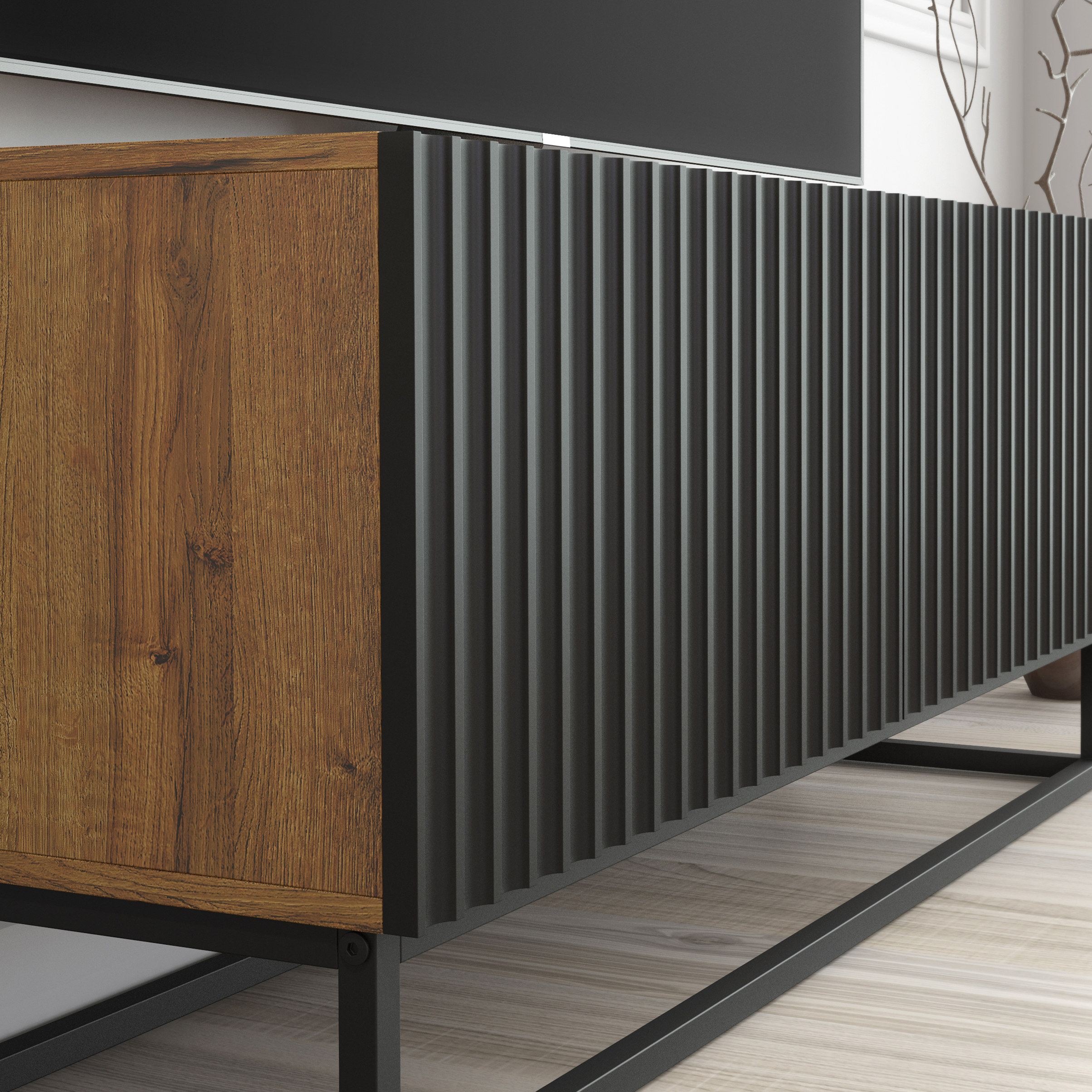Crafted with attention to every detail, the piece stands on a refined black steel frame that adds a light, sculptural feel while ensuring exceptional durability. The fluted texture and contrasting colour palette give this unit a designer-quality appearance that elevates both light and dark interiors.