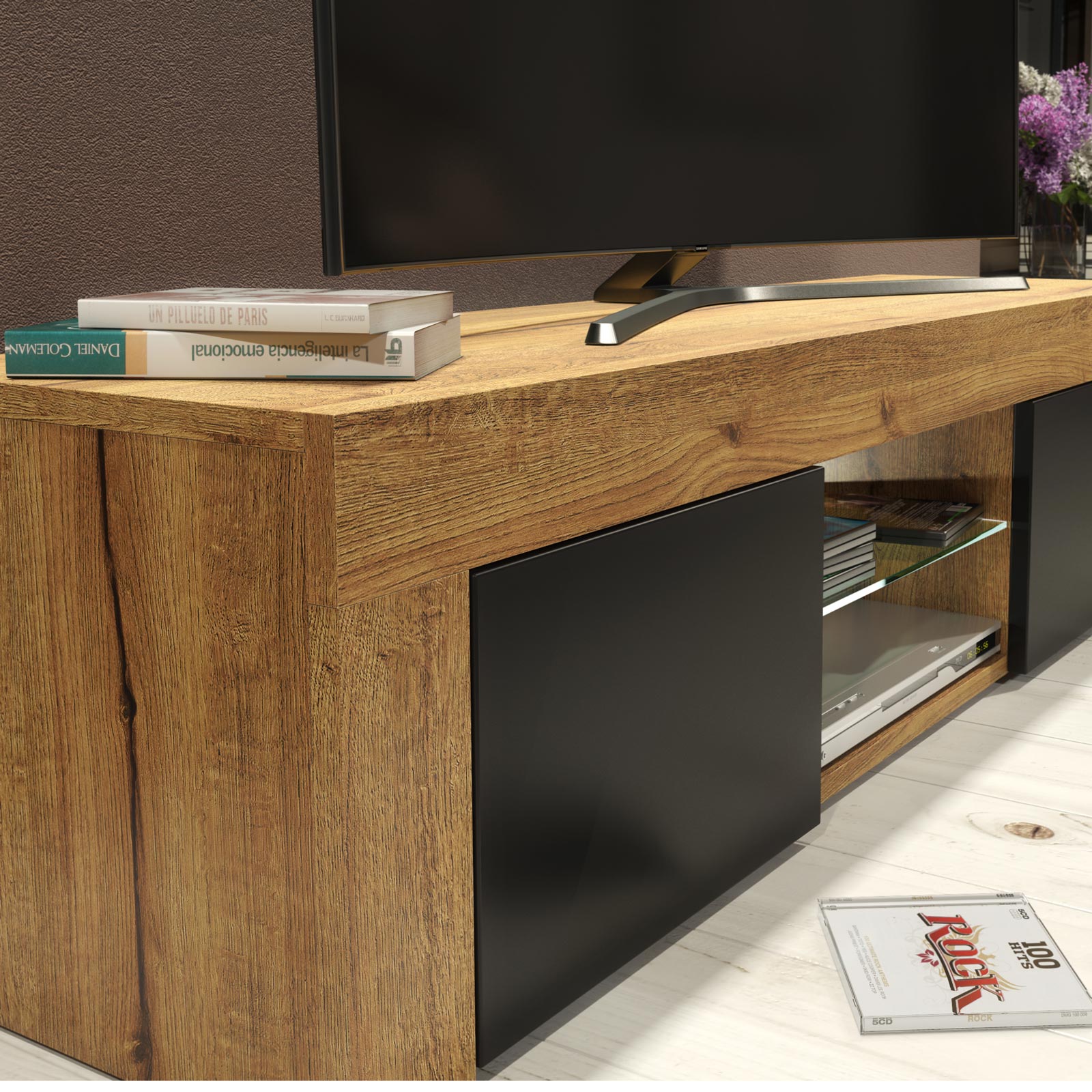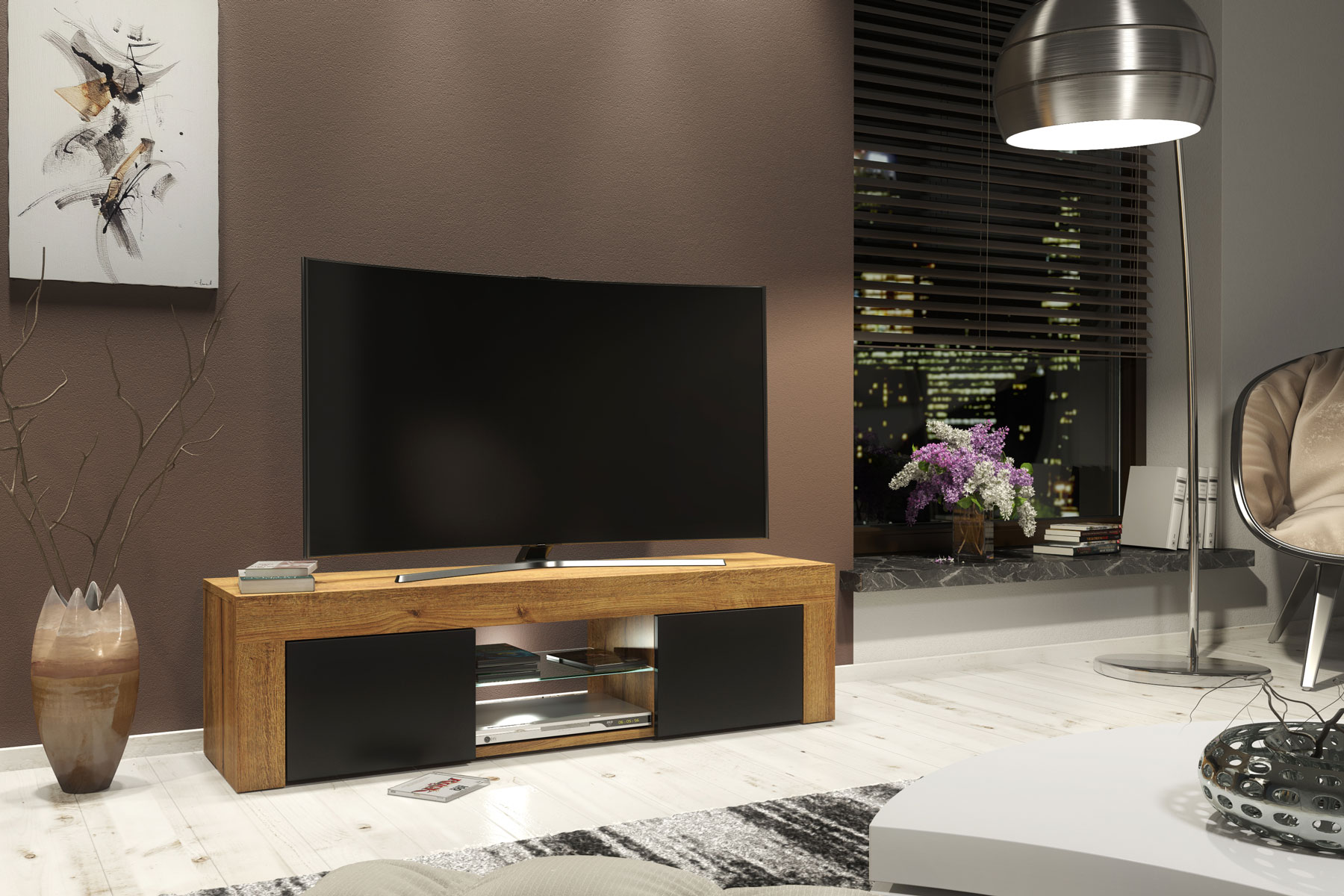 Create a strong, modern statement in your living room with this 130cm Oak Matt & Black Matt TV unit from Olivia Furniture. Designed for interiors that favour clean lines, natural textures, and bold contrast, this media cabinet combines practical storage with a refined, architectural look.