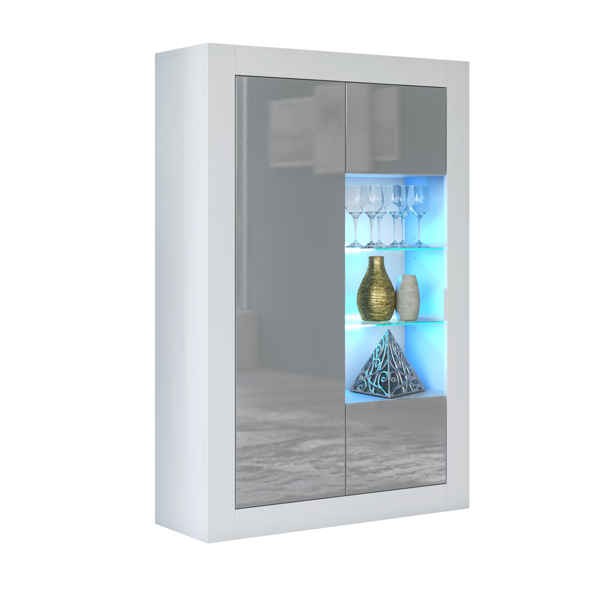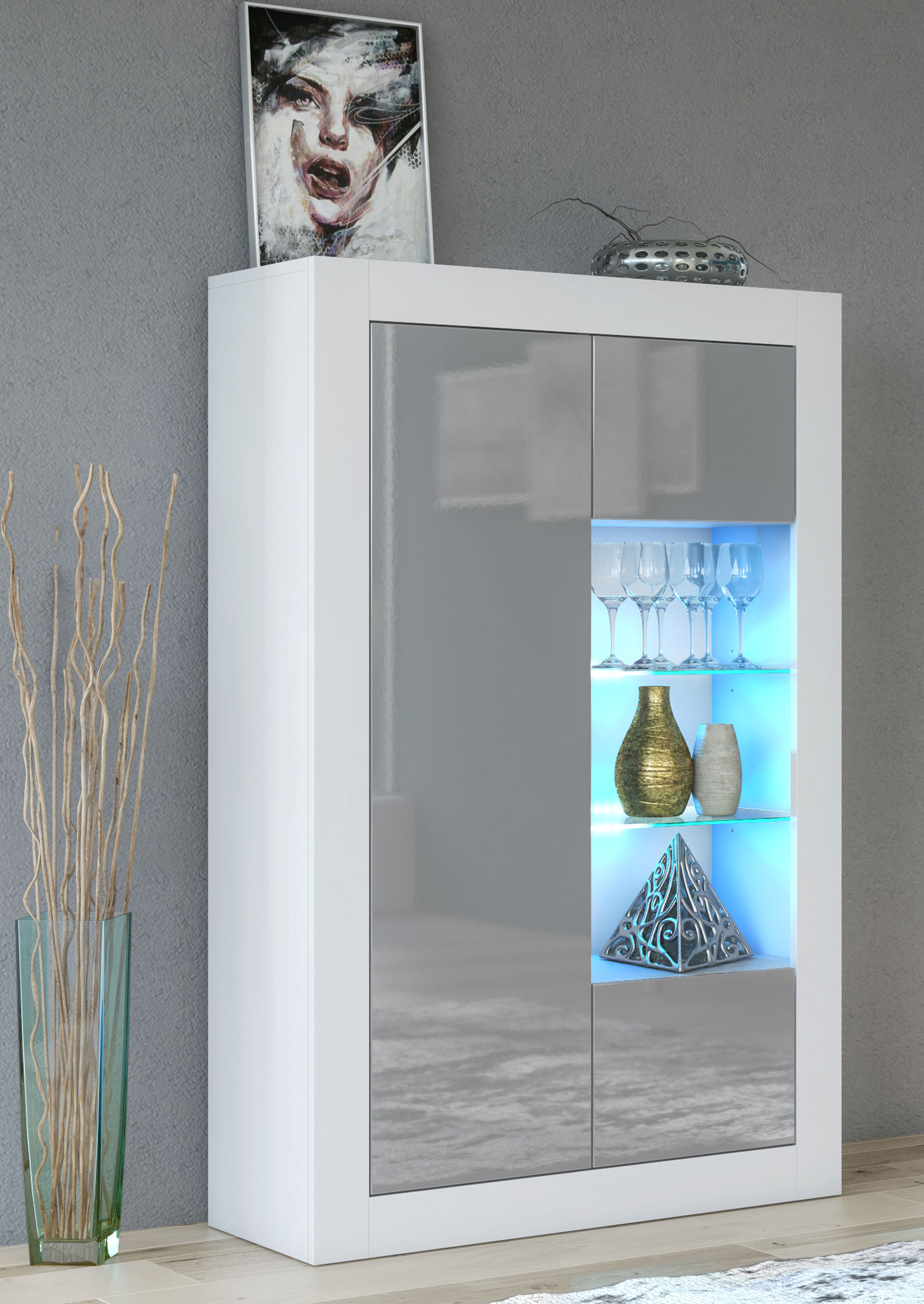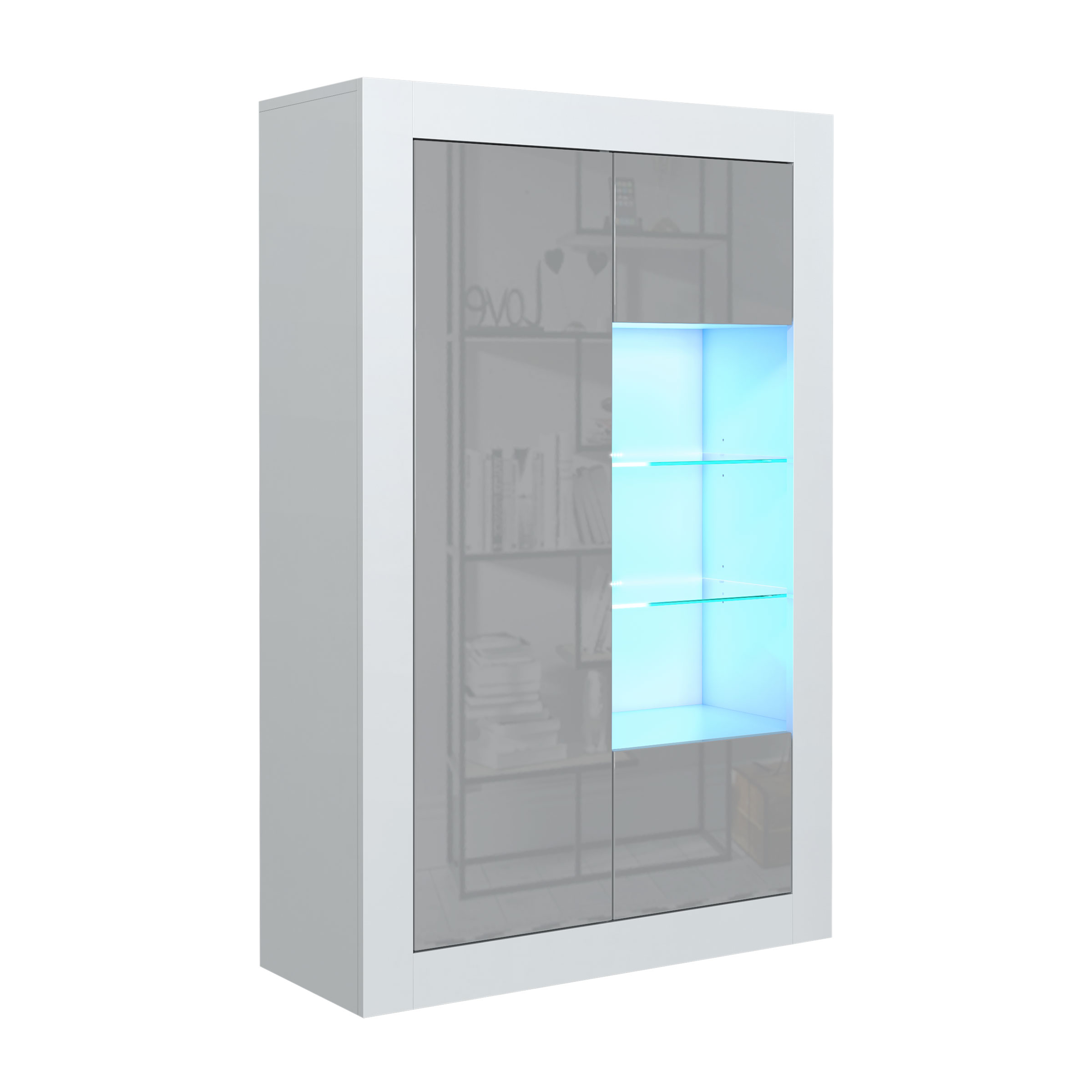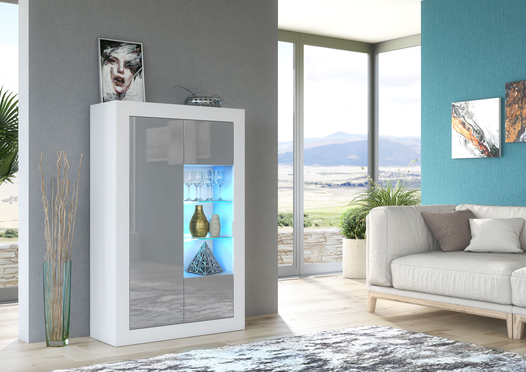 Finished in a white matt body with grey high-gloss doors, this display cabinet introduces contrast and depth, making it an excellent choice for modern living rooms, dining areas, or open-plan interiors.