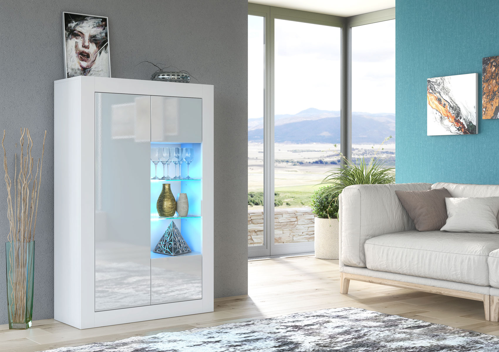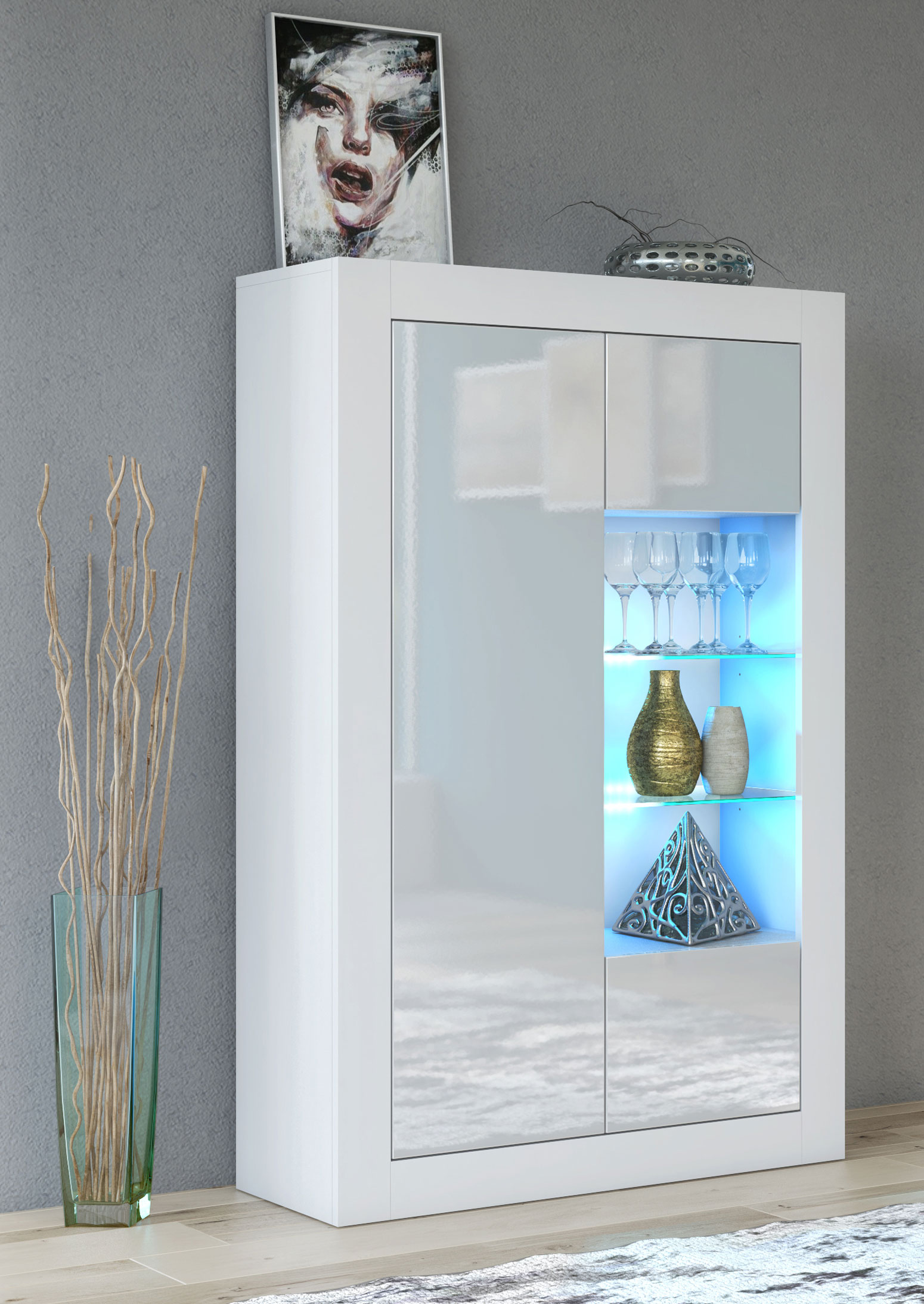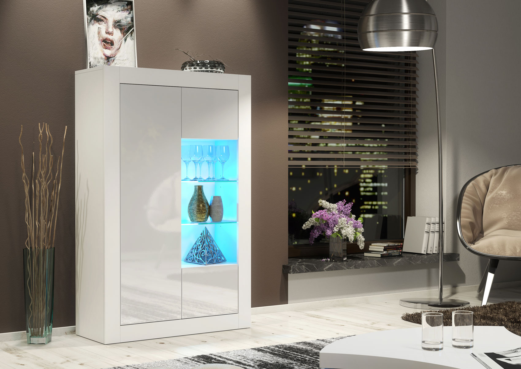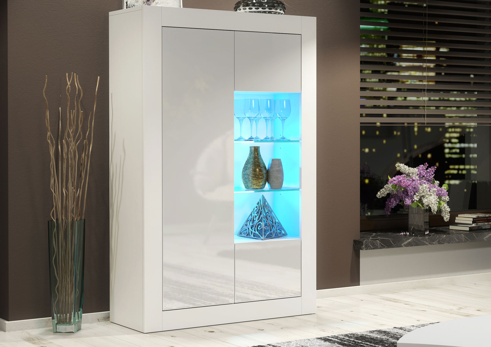 Finished in a white matt body with white gloss doors, this display cabinet brightens the room and complements both neutral and modern interiors with ease.