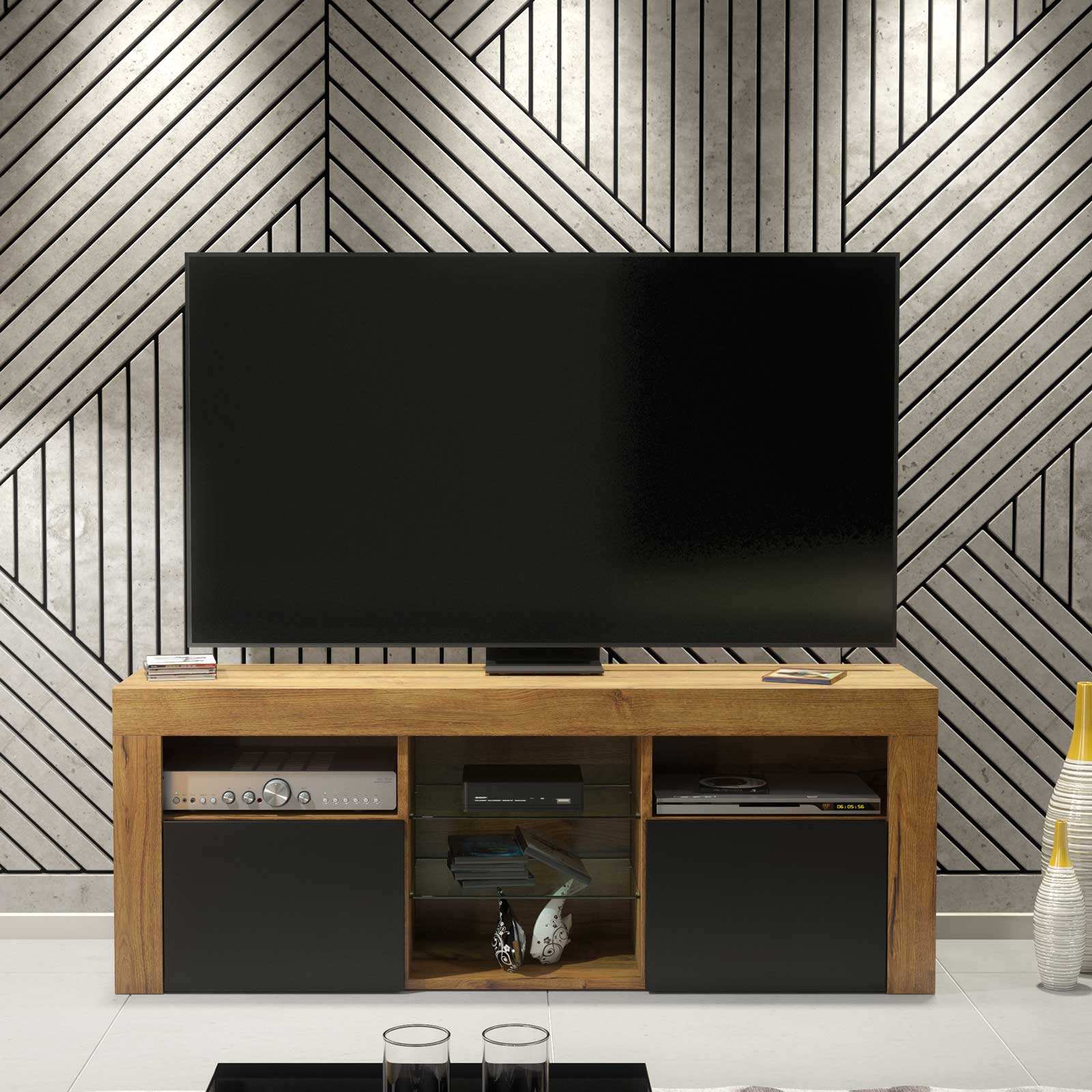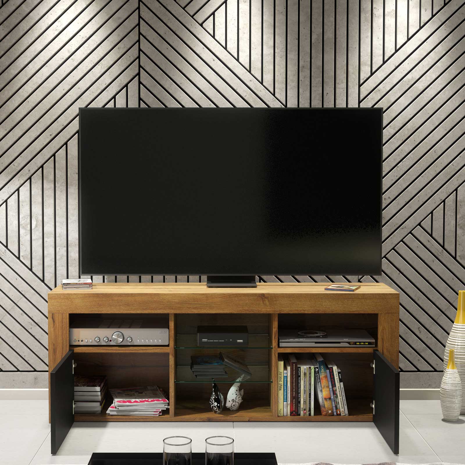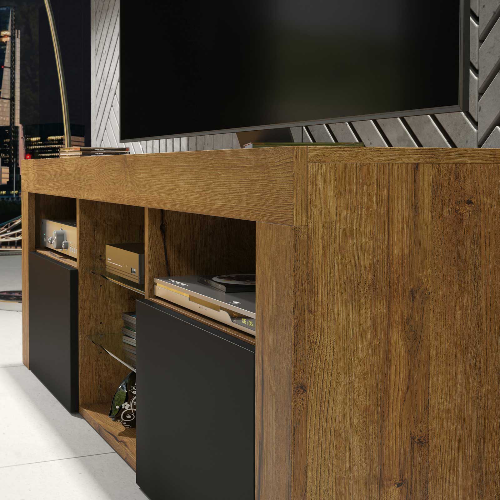 Pair with black metal accents and neutral décor to emphasise the contrast between the natural oak tone and bold matt black fronts for a sophisticated, modern entertainment space.