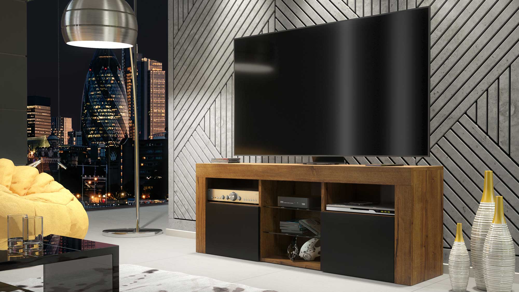 This modern 145cm TV unit by Olivia Furniture combines warm oak tones with bold black matt fronts, creating a refined statement piece for contemporary living spaces. Designed to balance aesthetics and practicality, it delivers smart storage solutions while enhancing the overall look of your room.