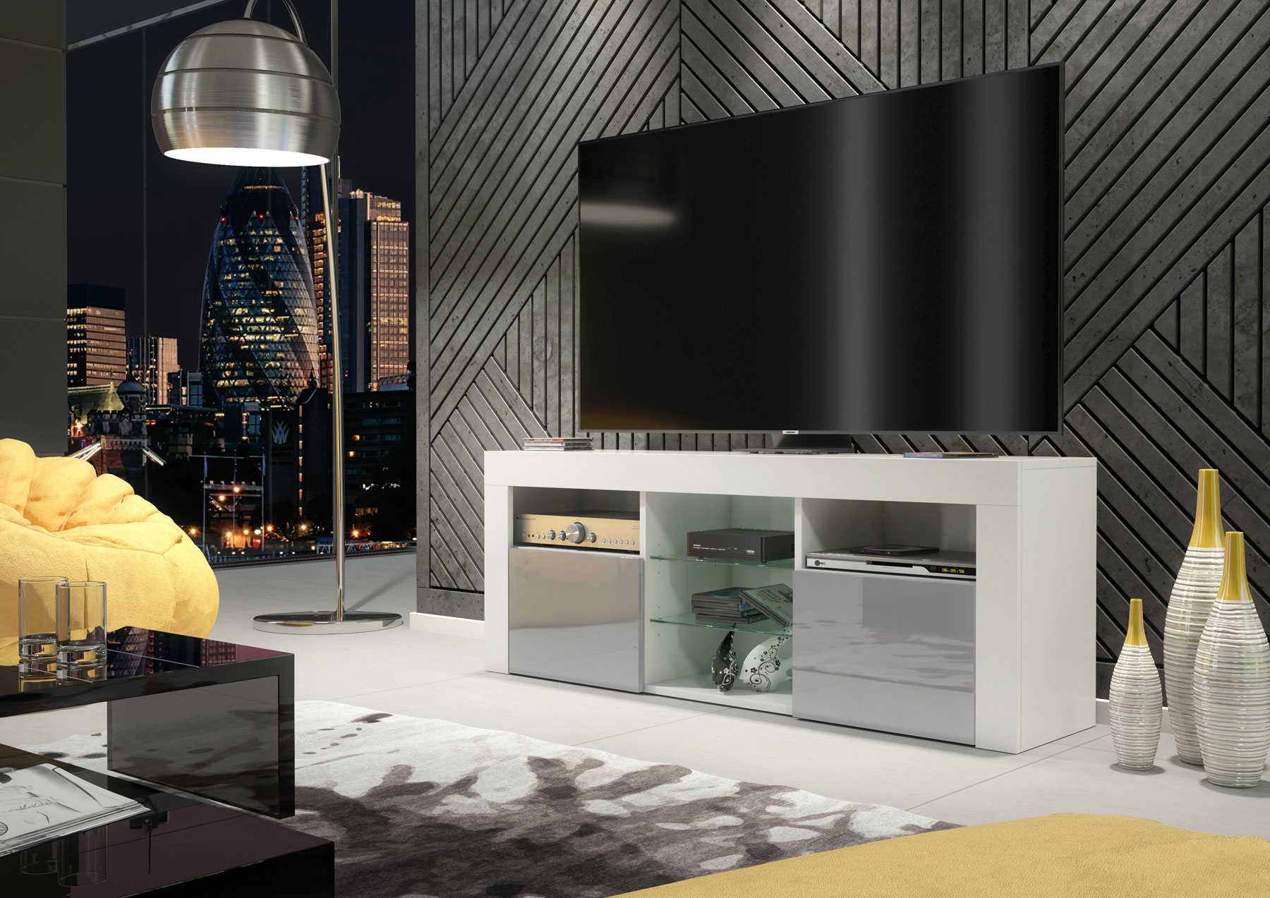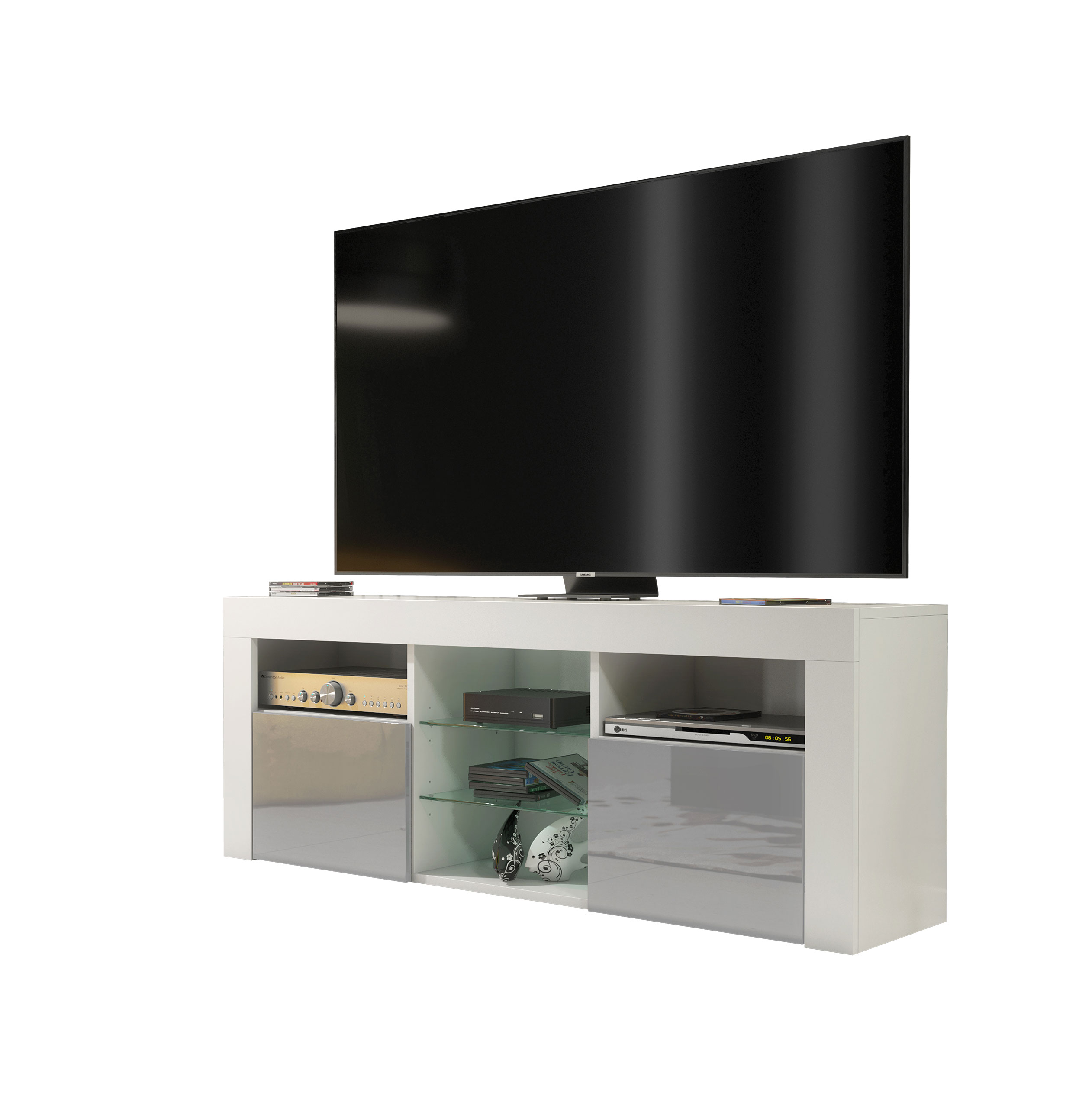 Pair with grey textiles, neutral tones, and minimalist décor to highlight the contrast between the matt white body and glossy grey doors for a clean, modern entertainment space.