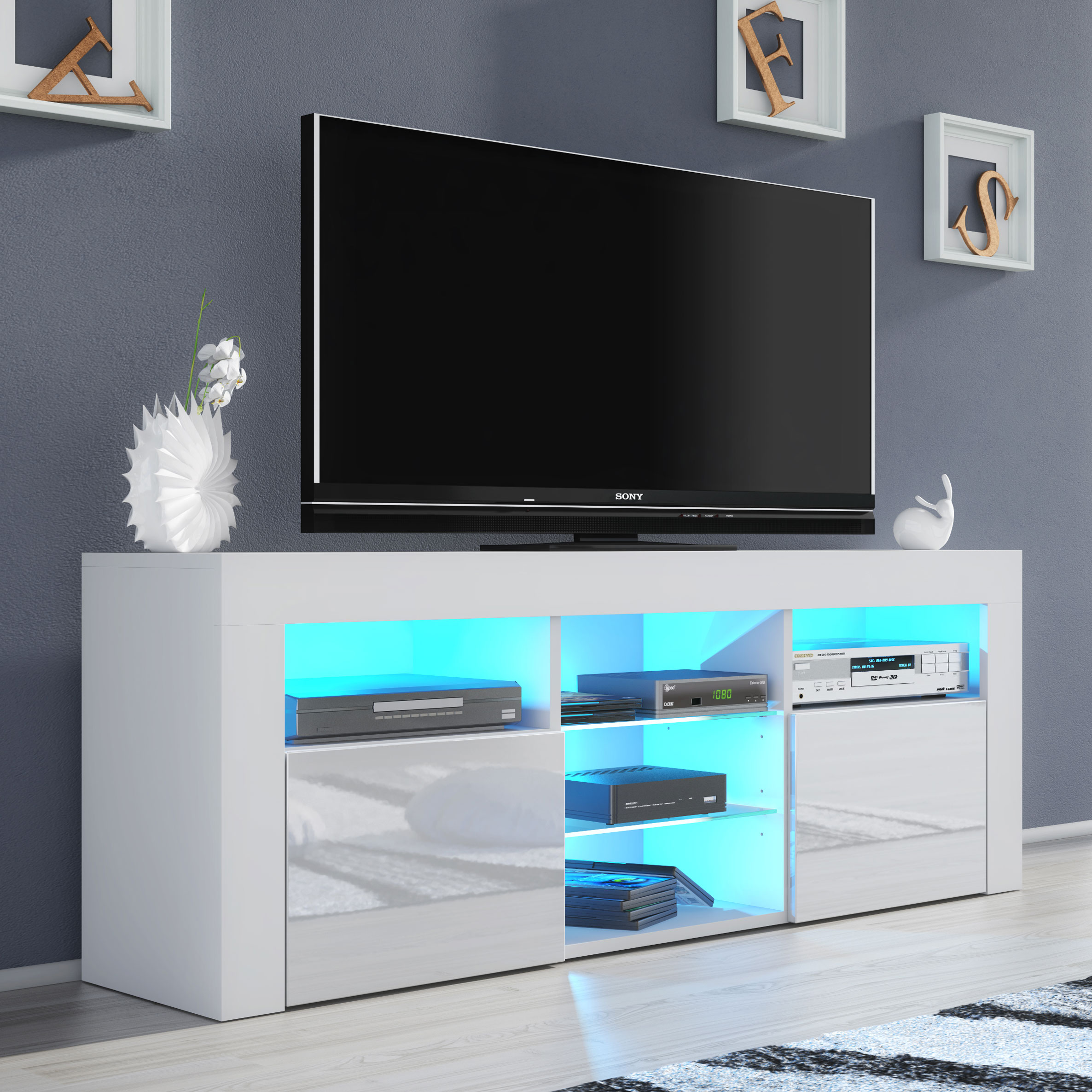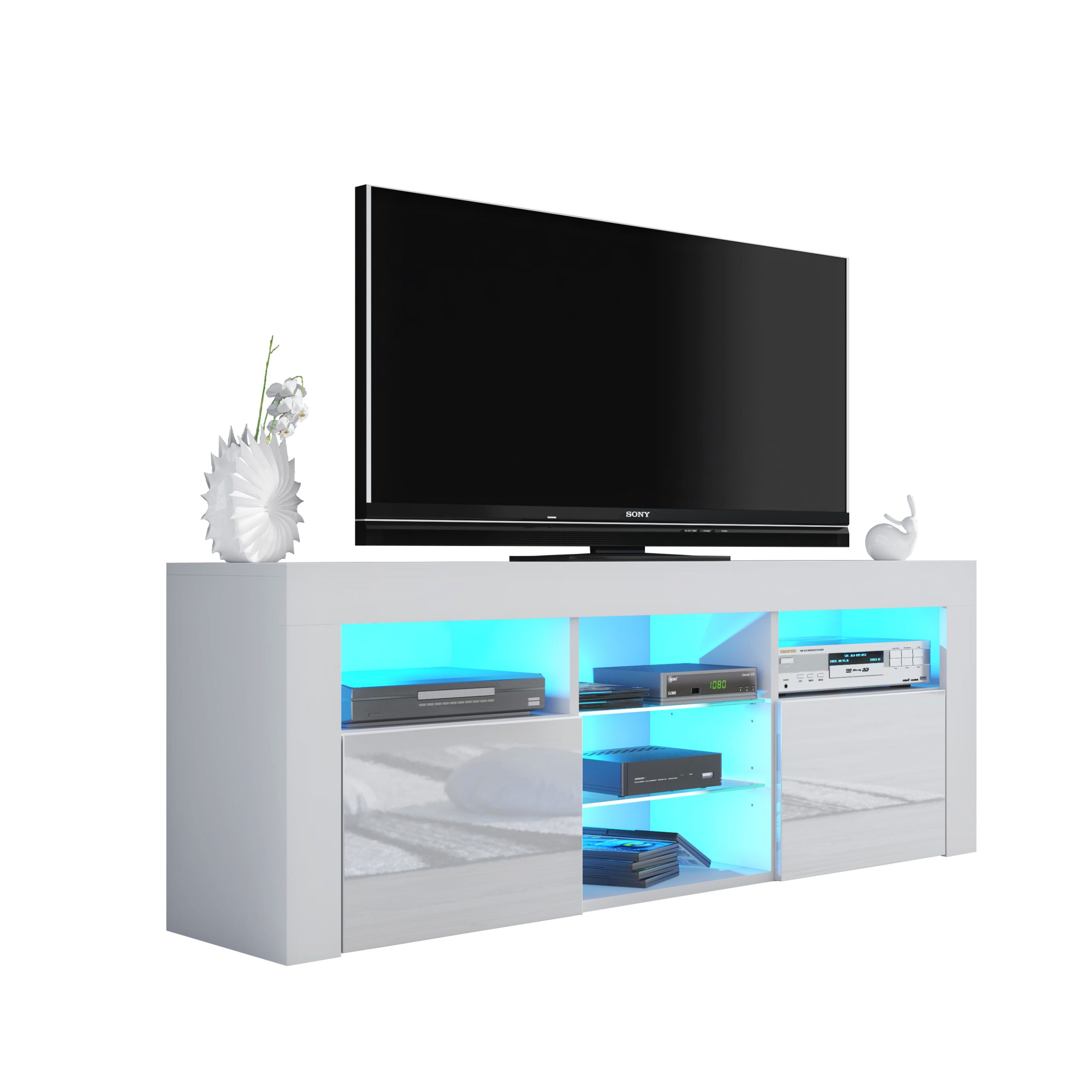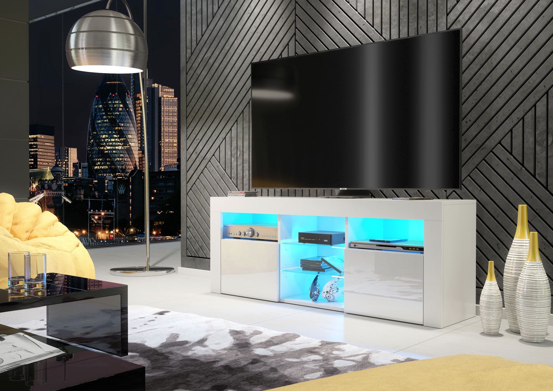 At the centre, the TV unit includes two glass shelves, creating a modern display and storage zone for media devices, consoles, or decorative pieces. In total, the unit is fitted with four glass shelves, supplied with FREE LED lights, adding subtle ambient illumination and enhancing the overall contemporary look.