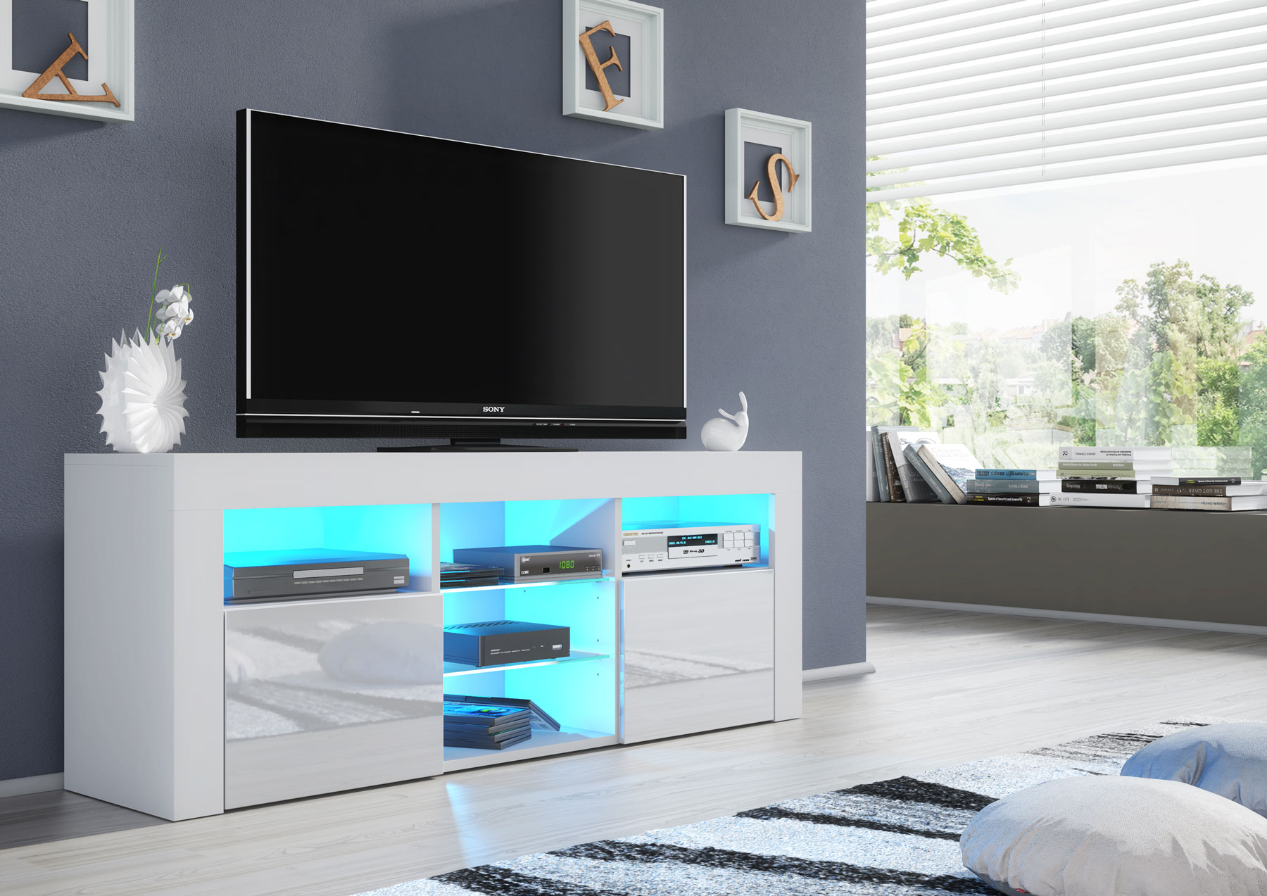 Finished in a white matt body paired with elegant white gloss doors, this TV unit reflects light beautifully and helps create a bright, spacious feel in both compact and open-plan interiors. Constructed from durable MDF and chipboard, it is designed to offer stability and reliability for everyday living while maintaining a refined, modern finish.
