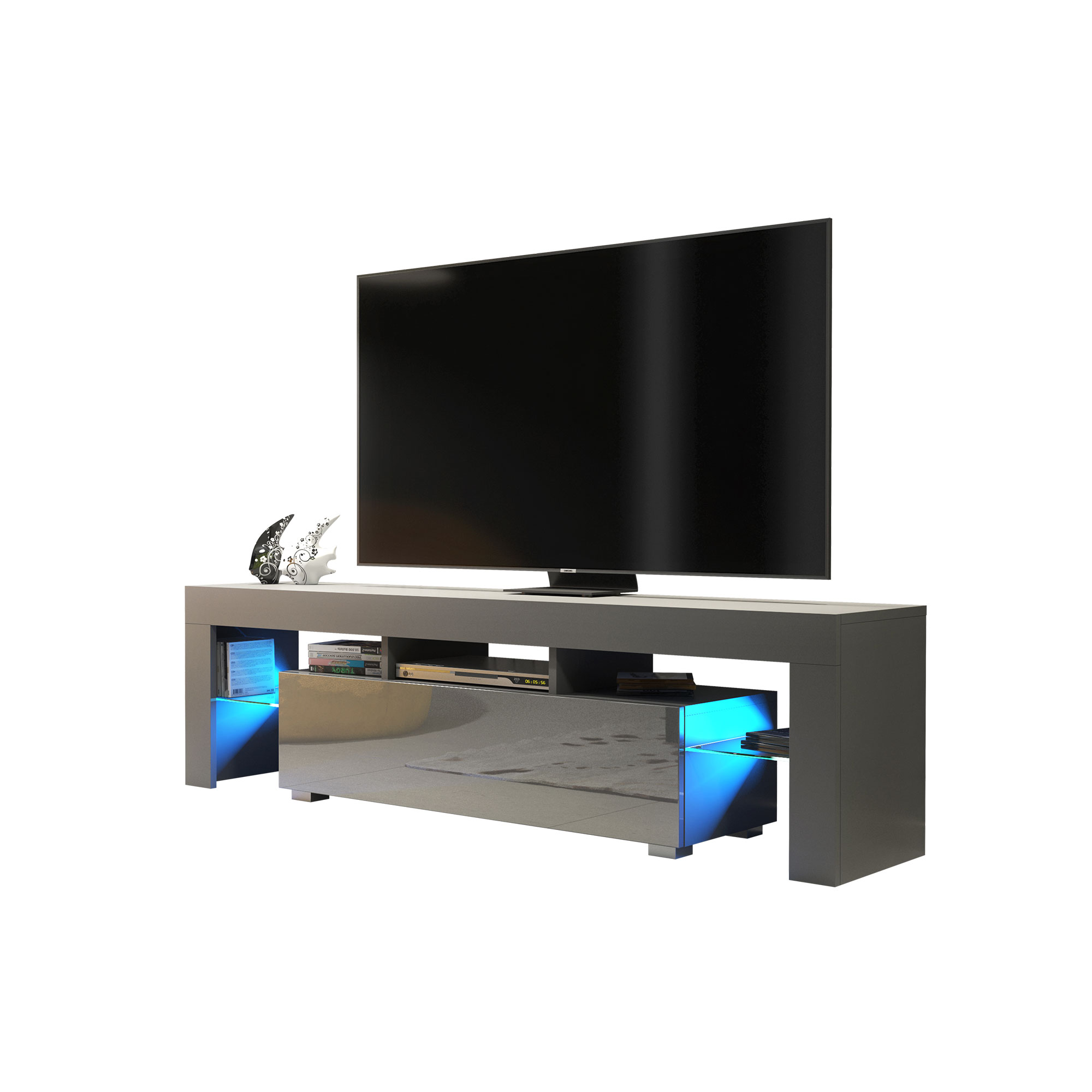 Finished in a grey matt body with matching grey gloss doors, this TV unit delivers a calm, monochrome aesthetic that works effortlessly in both light and darker interiors. Constructed from durable MDF and chipboard, it is designed for reliable everyday use while maintaining a clean, contemporary profile.