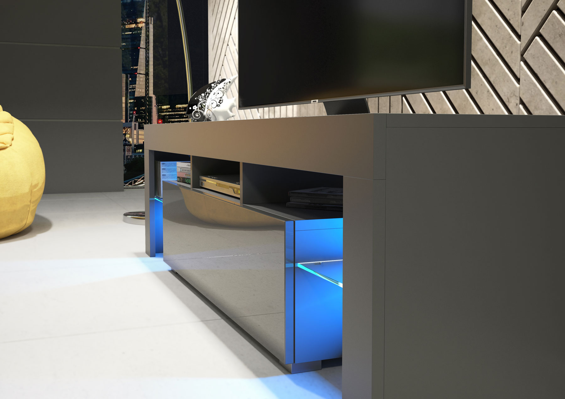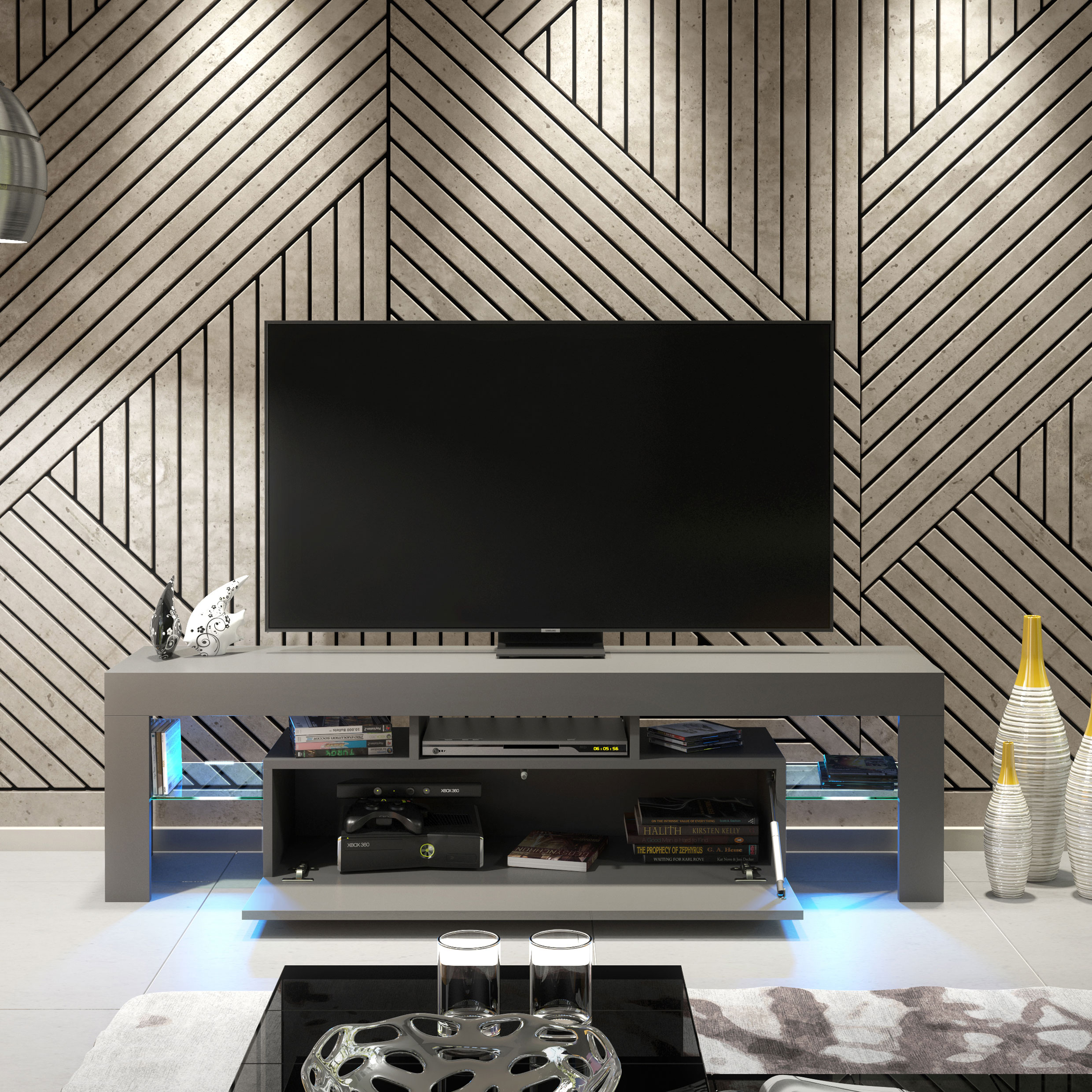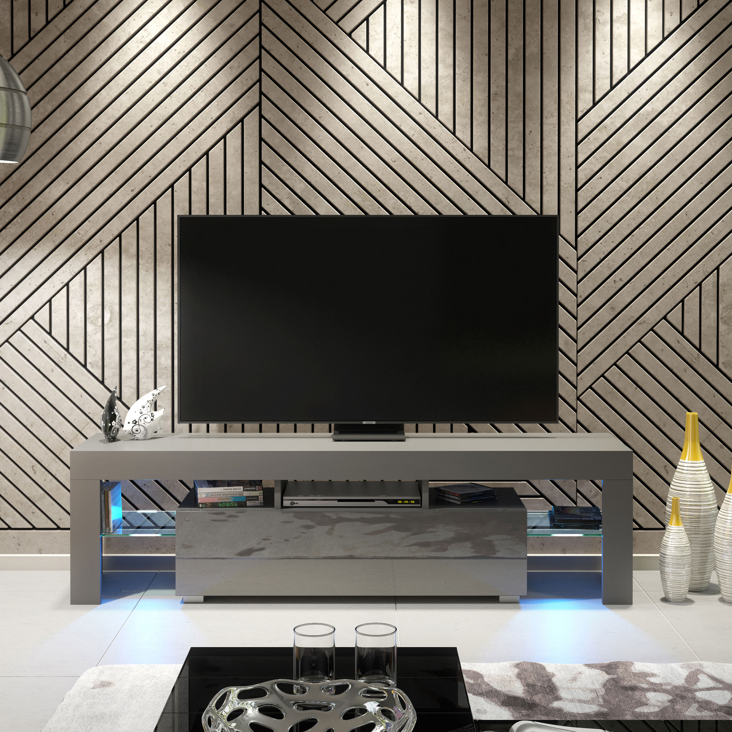 Style with layered grey tones, soft lighting, and minimalist décor to emphasise the matt and gloss contrast and create a calm, contemporary entertainment space.