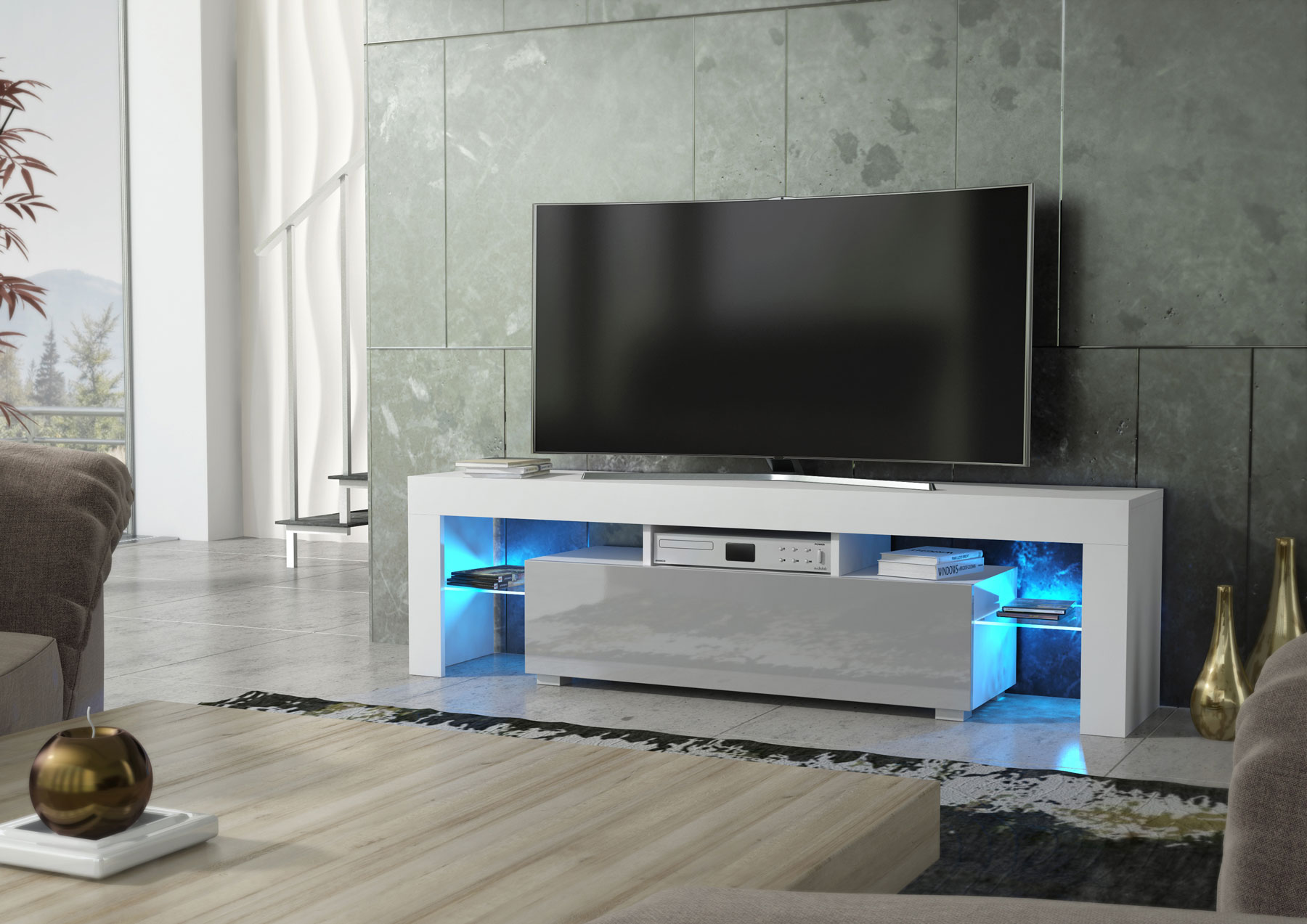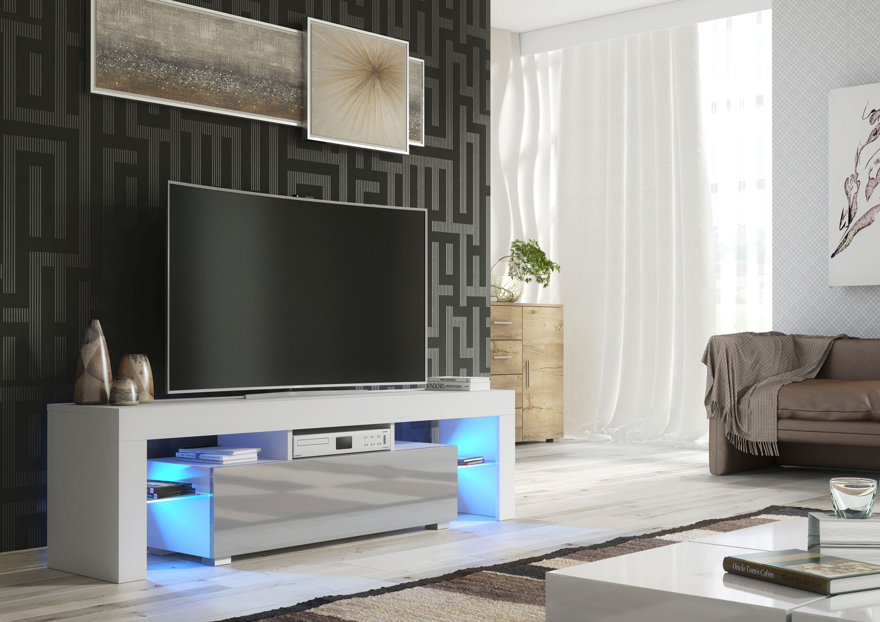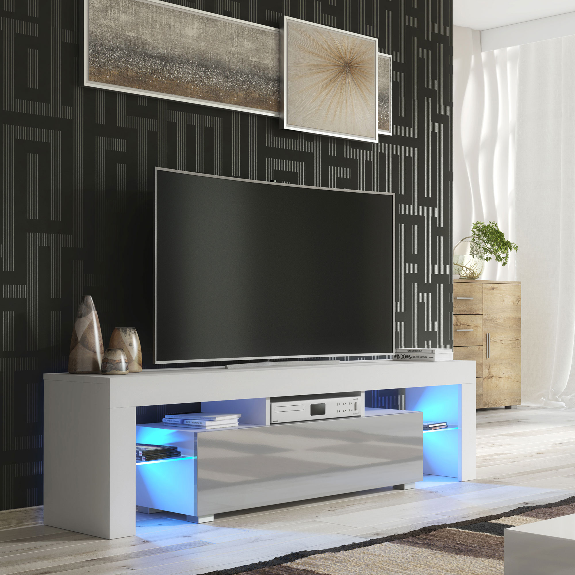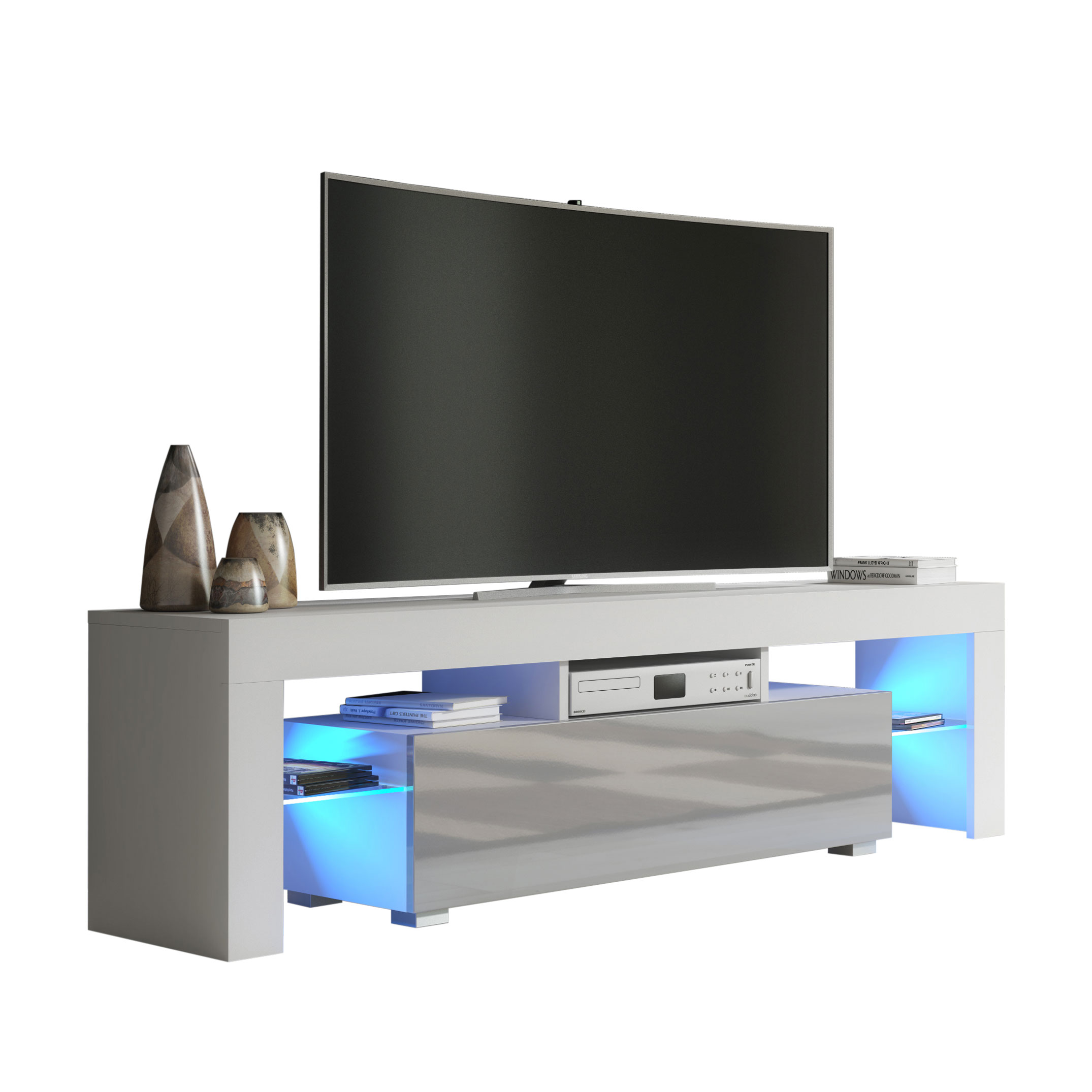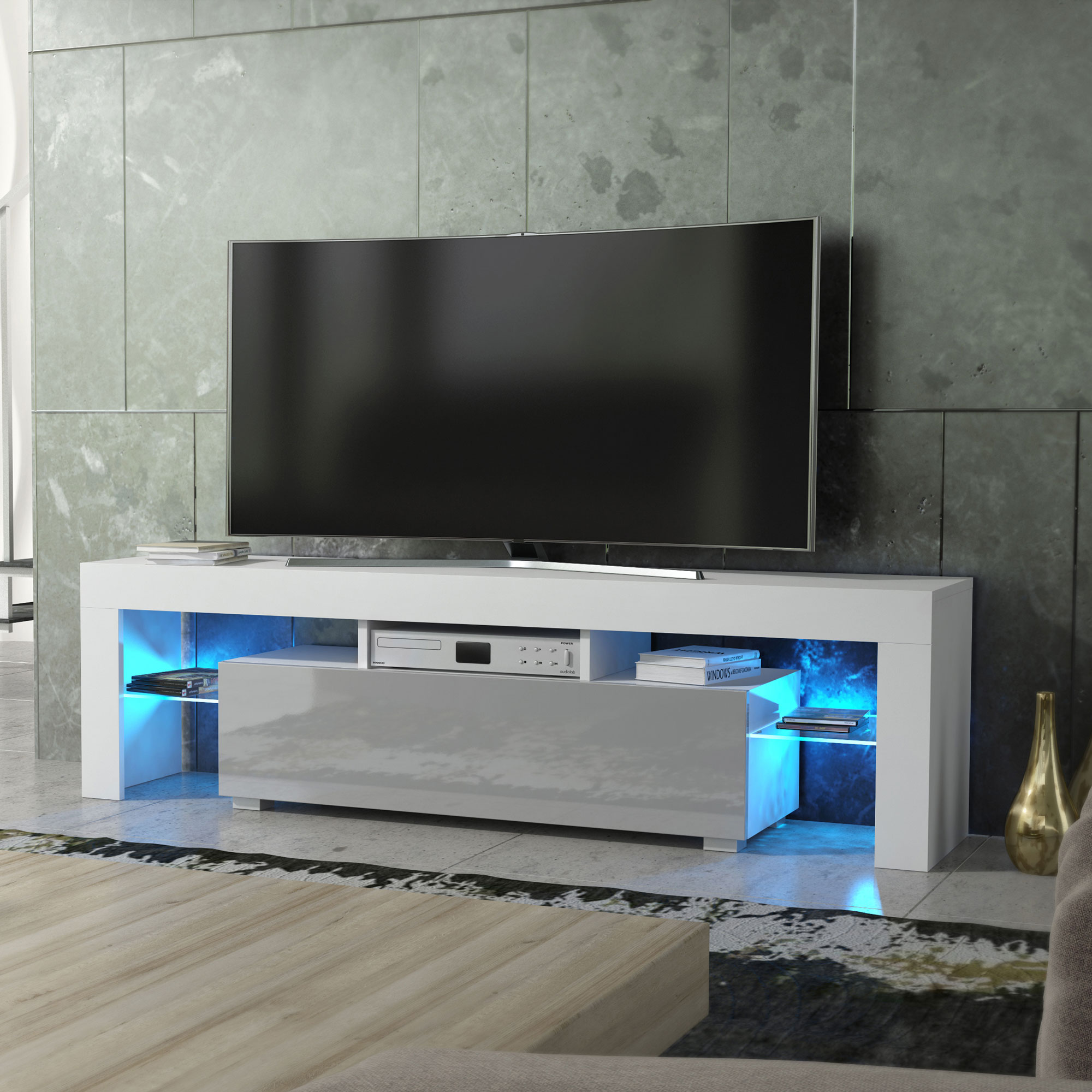 Finished in a white matt body paired with elegant grey gloss doors, this TV unit delivers a refined two-tone contrast that works beautifully in both light and darker interiors. Crafted from durable MDF and chipboard, it is built for reliable everyday use while maintaining a sleek, contemporary silhouette.