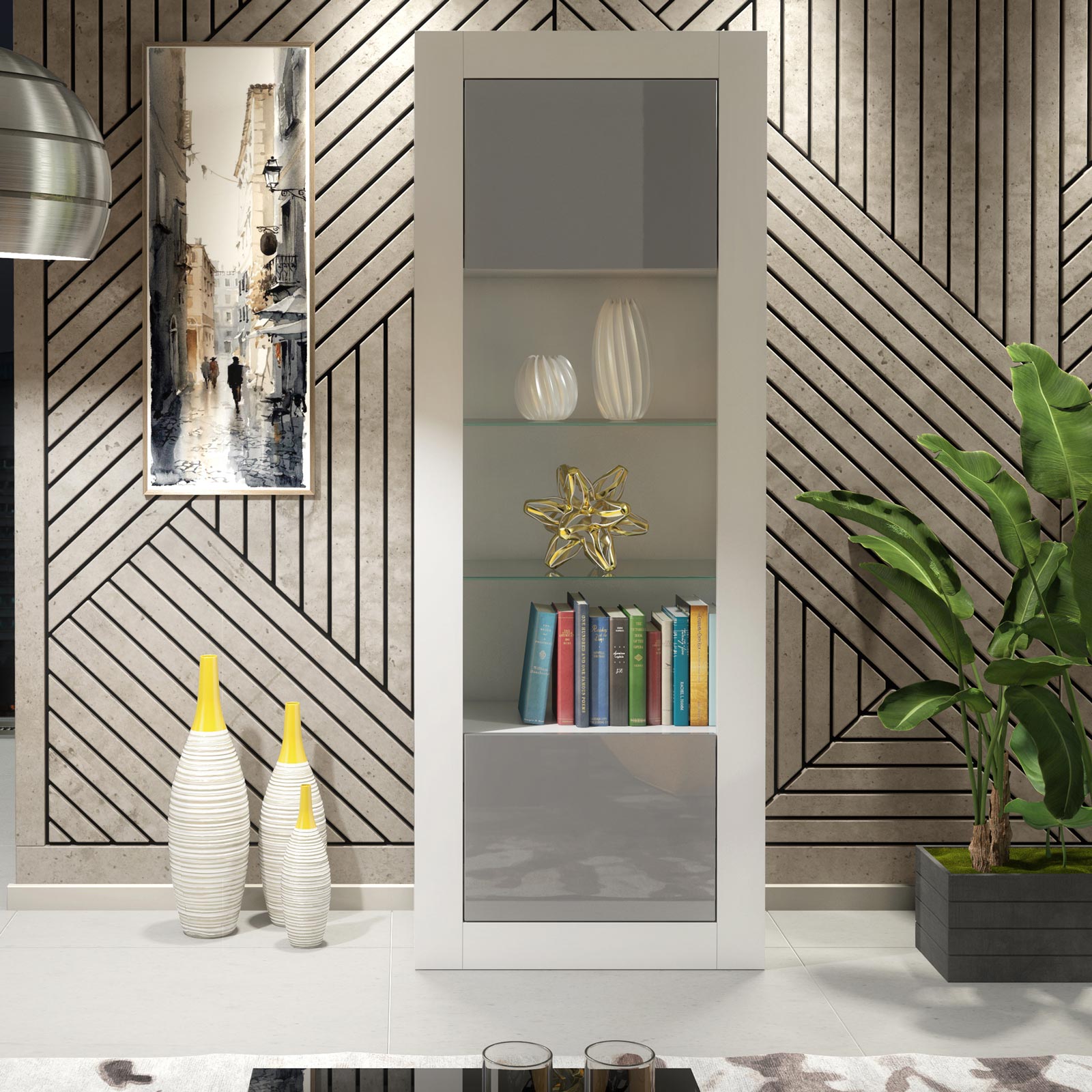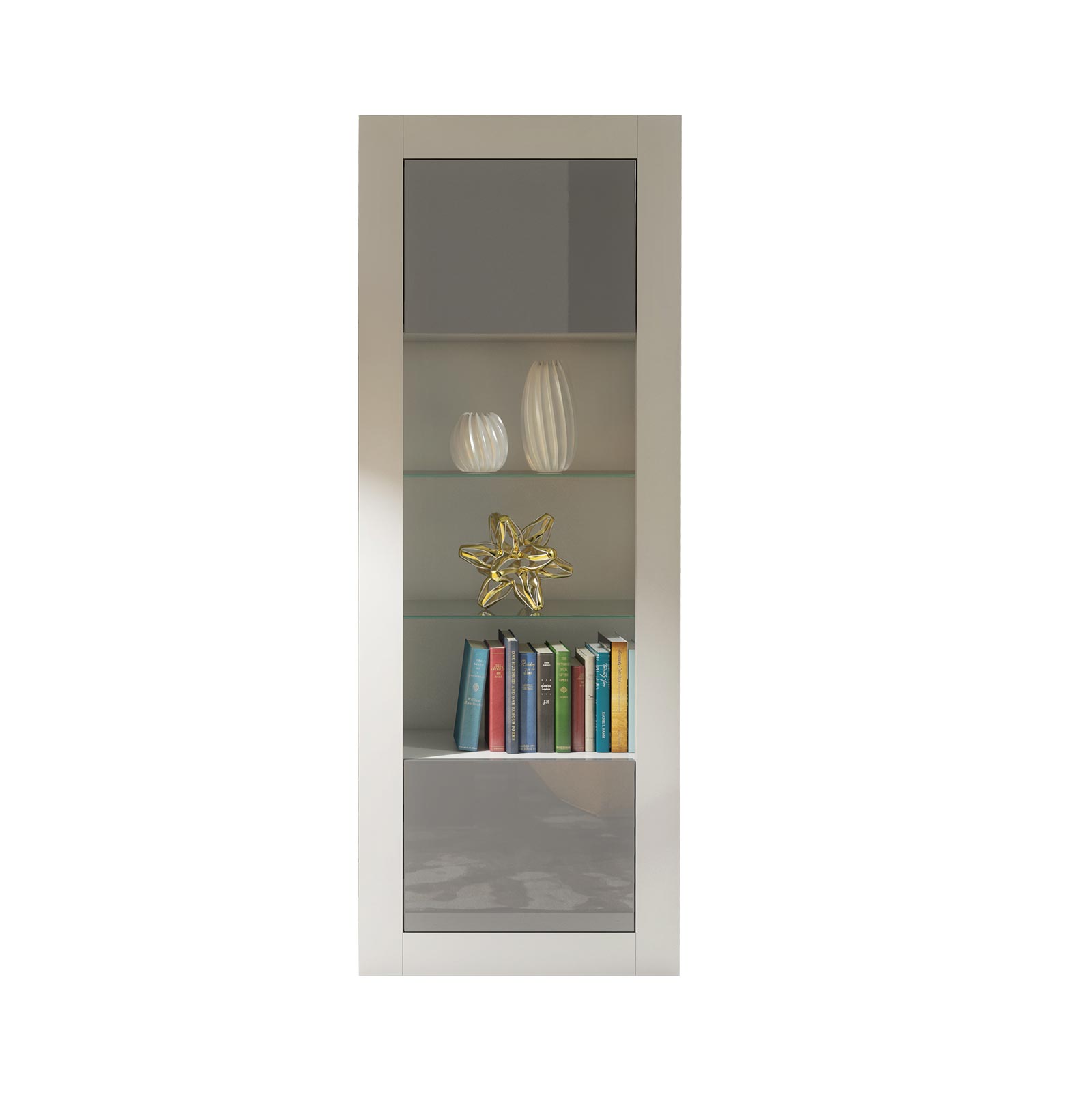 This Modern 170cm White Matt & Grey Gloss Display Cabinet is a contemporary storage and display solution designed for modern interiors that appreciate subtle contrast, clean lines, and everyday practicality. Designed by Olivia Furniture, this tall cabinet combines elegant presentation with generous concealed storage.