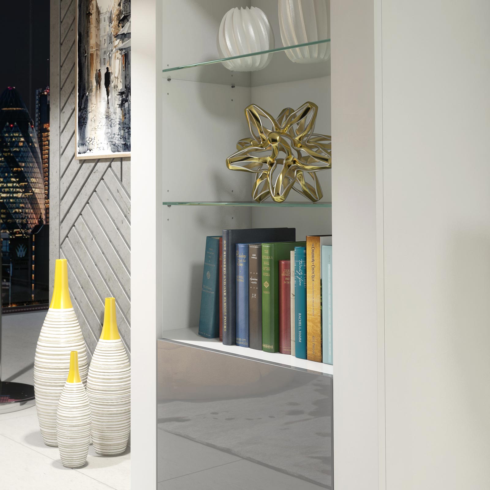 Style with neutral décor, glass accessories, and soft grey textiles to highlight the contrast between the matt white body and glossy grey doors for a calm, modern finish.