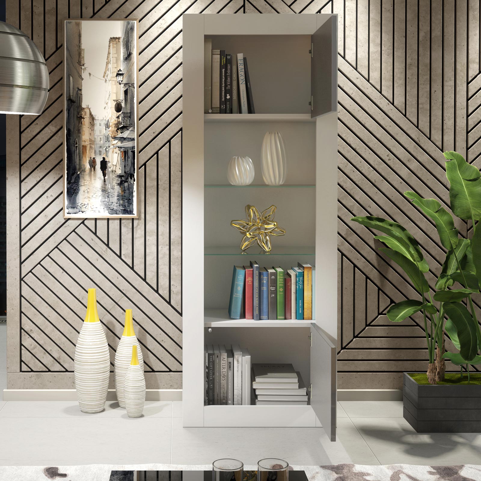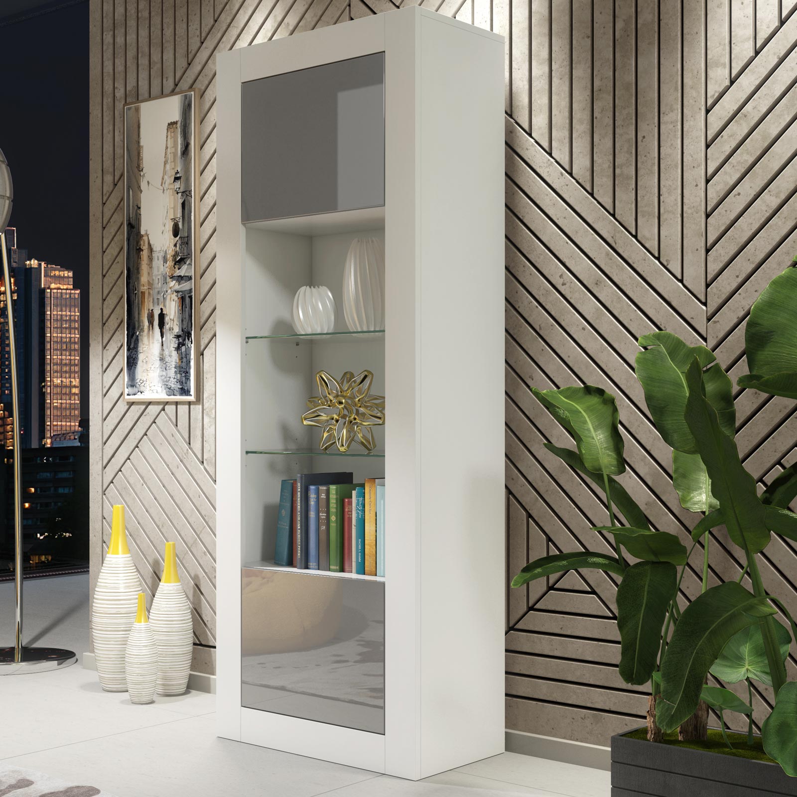Constructed from durable MDF and chipboard, this display cabinet is designed for reliable everyday use while maintaining a sleek, contemporary silhouette. Its tall, slim proportions make it suitable for both compact interiors and larger rooms.