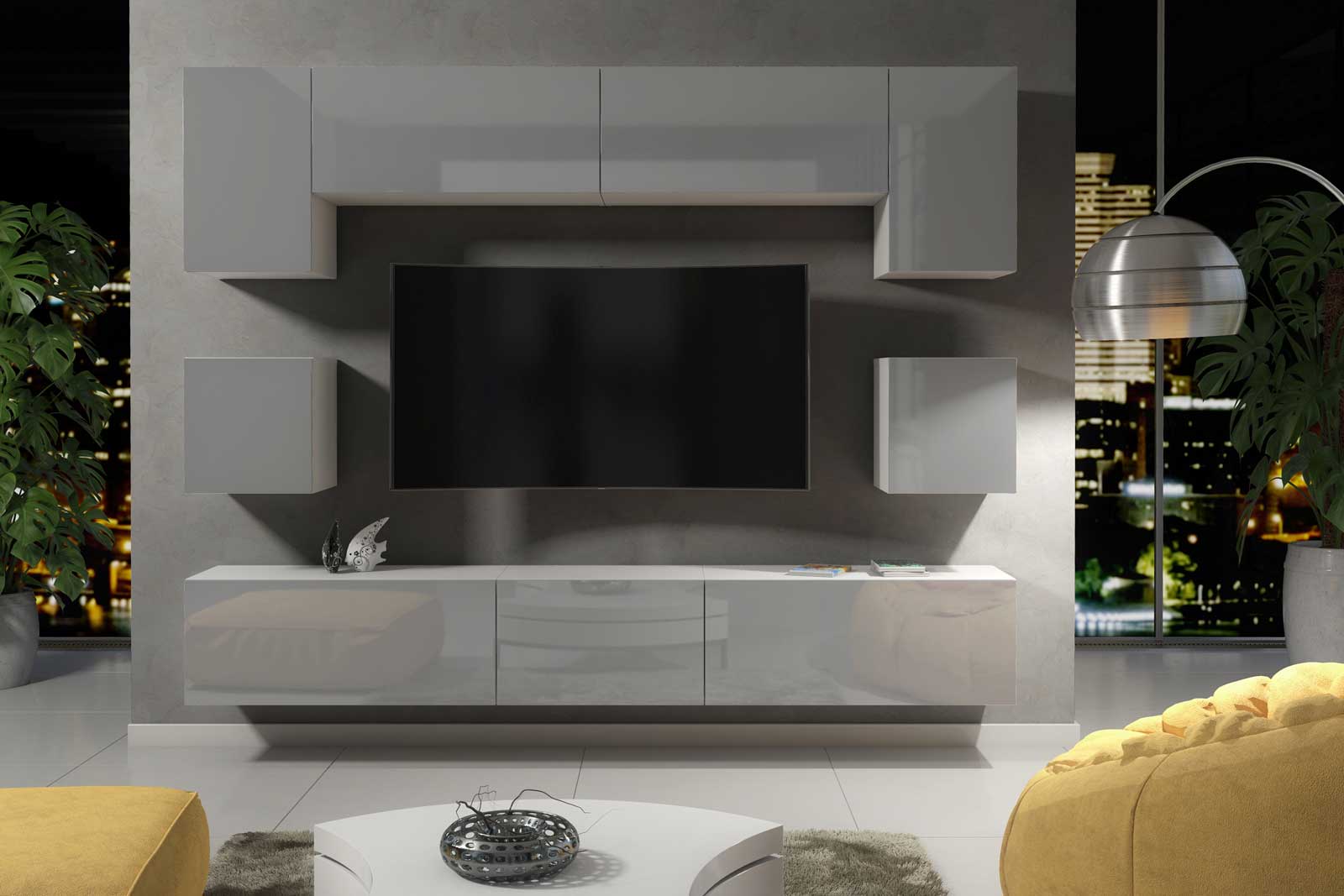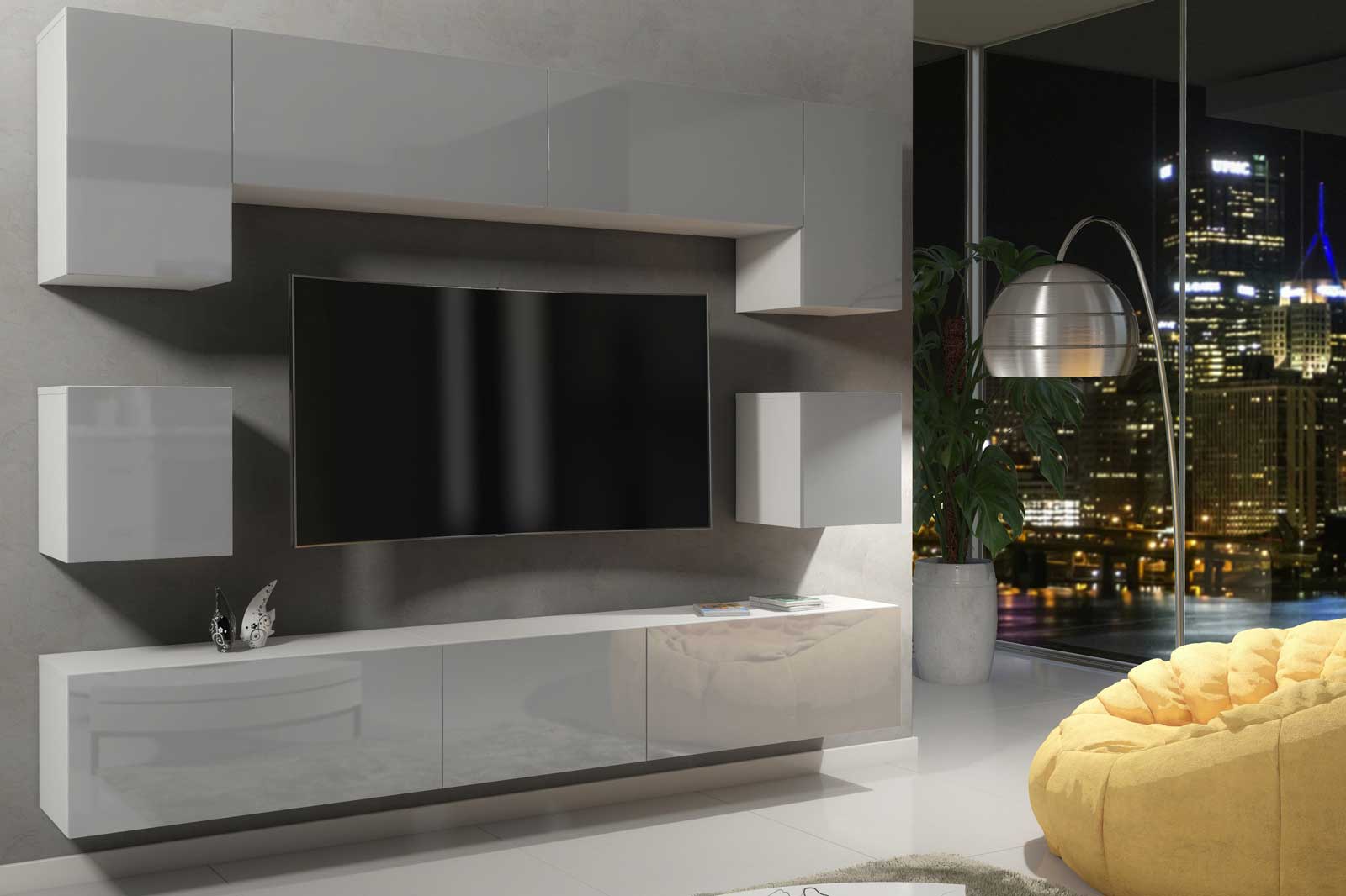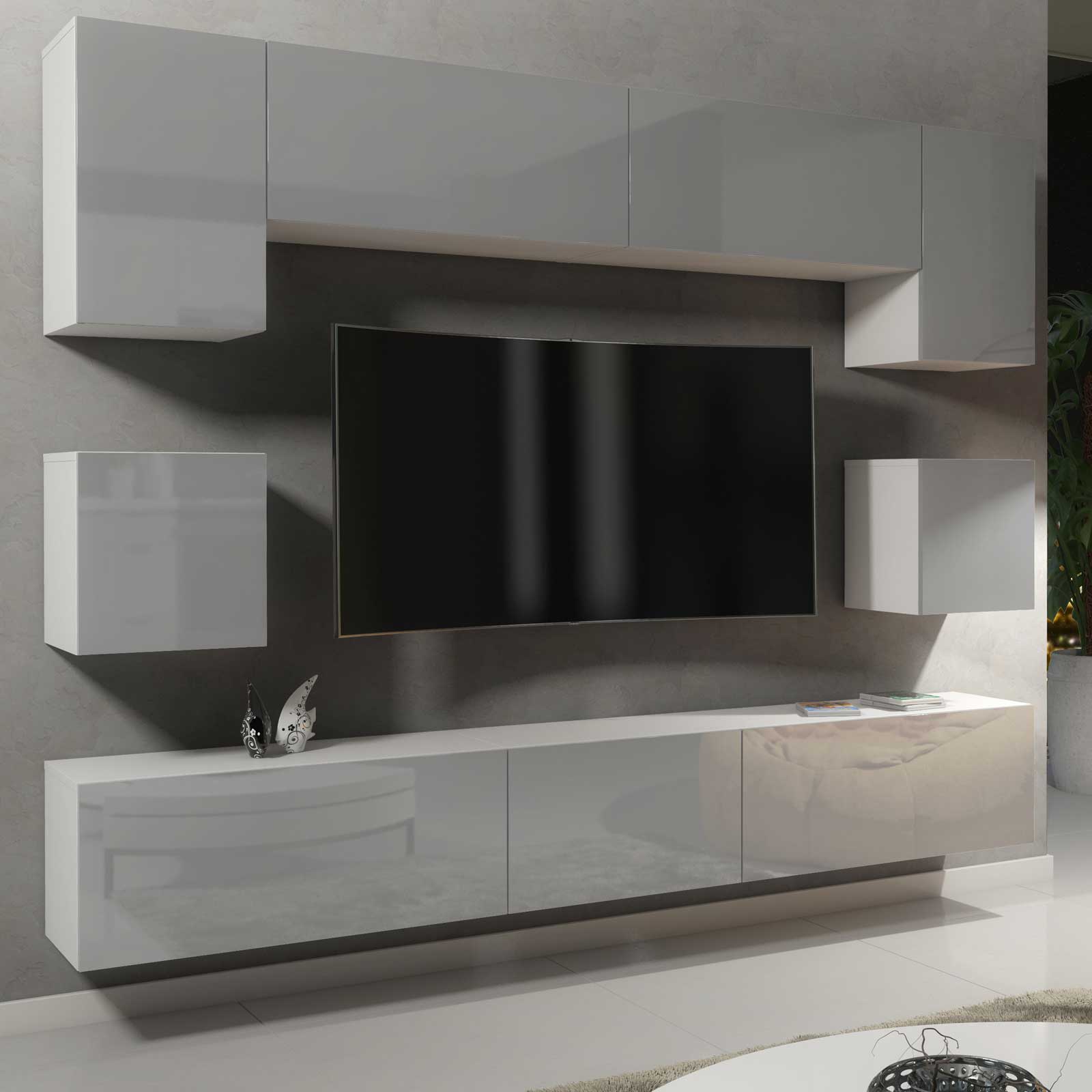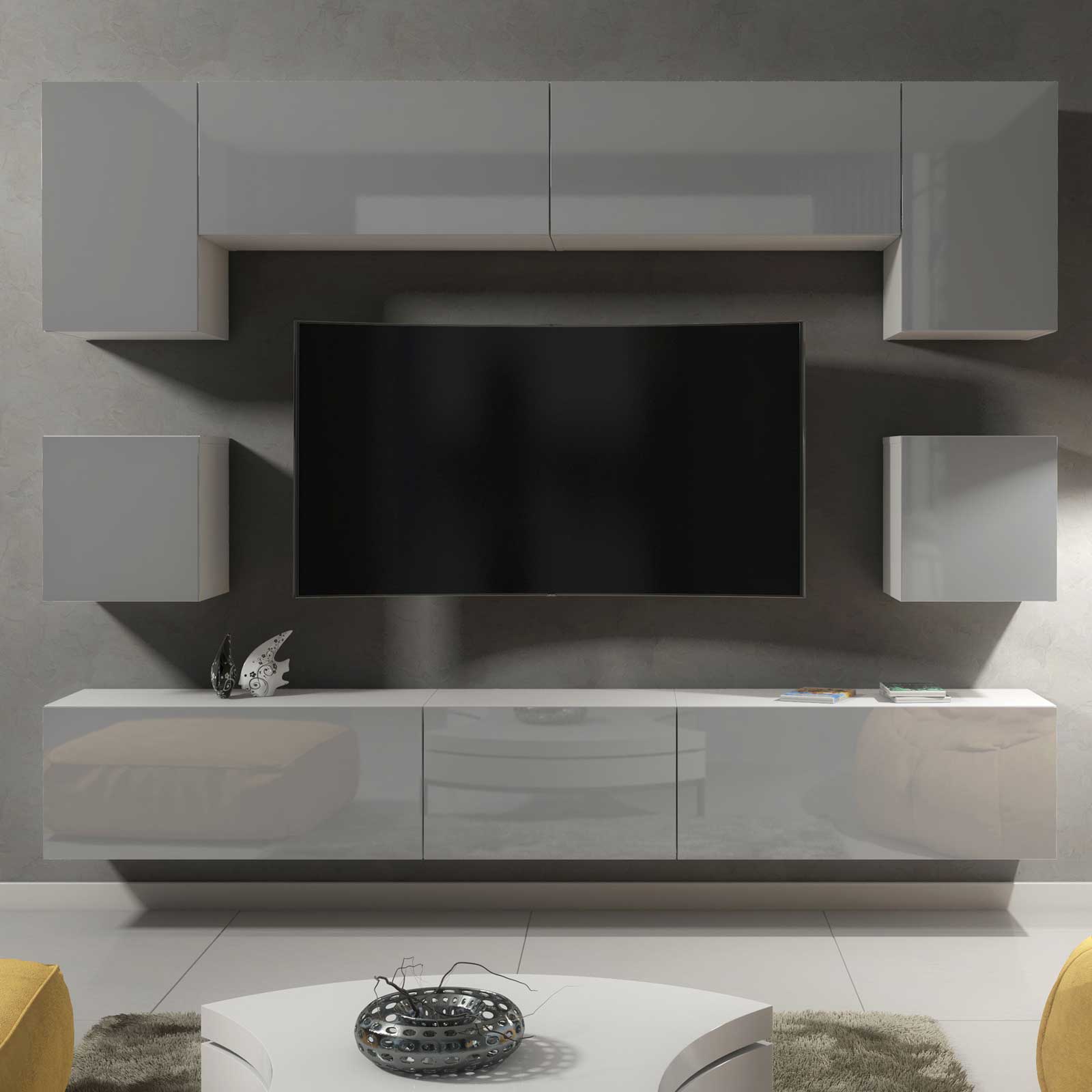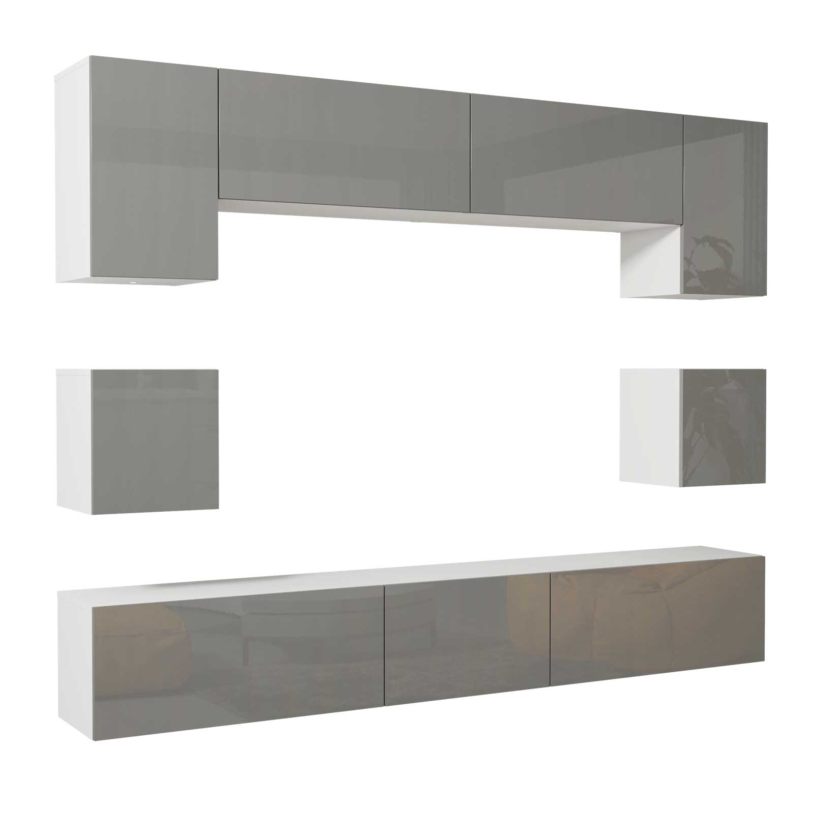 Modern Wall Unit 242cm – White Matt Body & Grey Gloss Doors – 9 Piece Modular Living Room Furniture Set