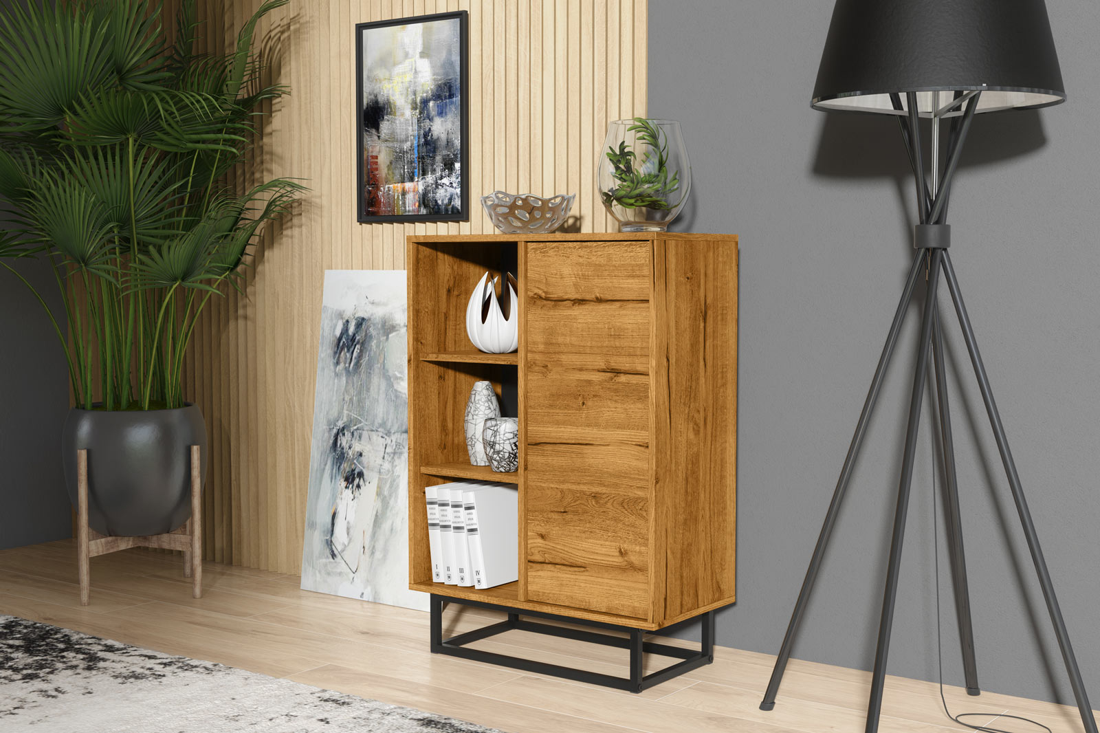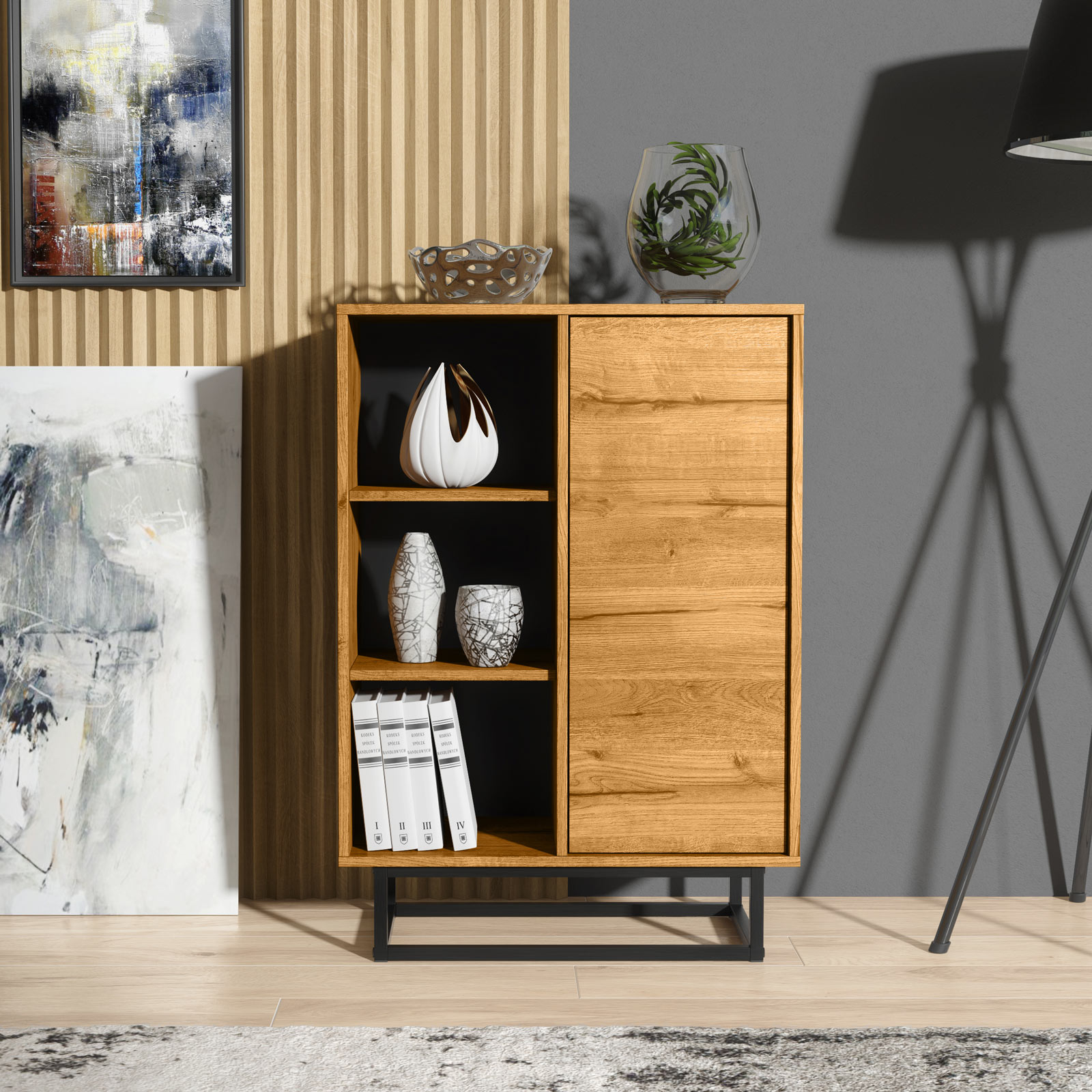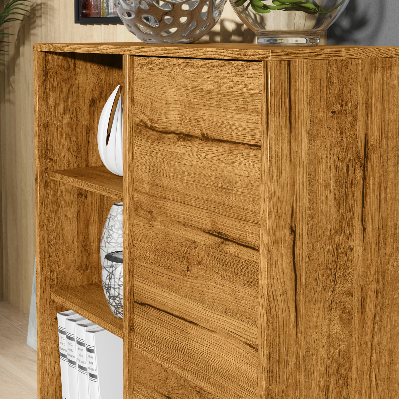 On the right side, the cabinet features a push-to-open door, maintaining a smooth, handle-free appearance. Behind the door are two internal shelves, offering practical concealed storage for books, documents, home accessories or everyday essentials.