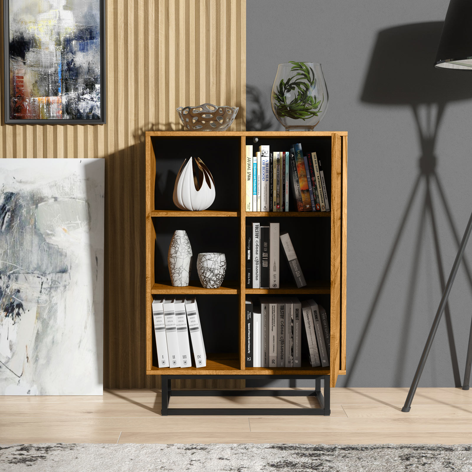 The warm oak finish adds natural texture and depth, while the slim black metal frame base delivers a sharp architectural edge. This oak and black combination fits perfectly into modern, Scandinavian and minimalist interiors.