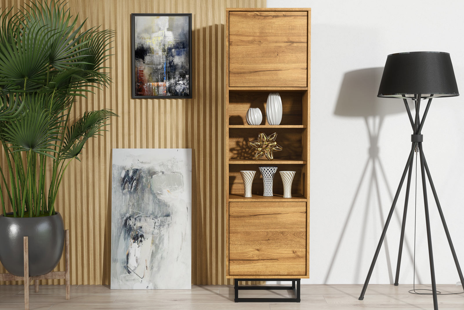 Pair with black metal lighting, neutral walls and textured fabrics to enhance the oak and black contrast. Add sculptural décor pieces to the open shelves to emphasise height and vertical balance.