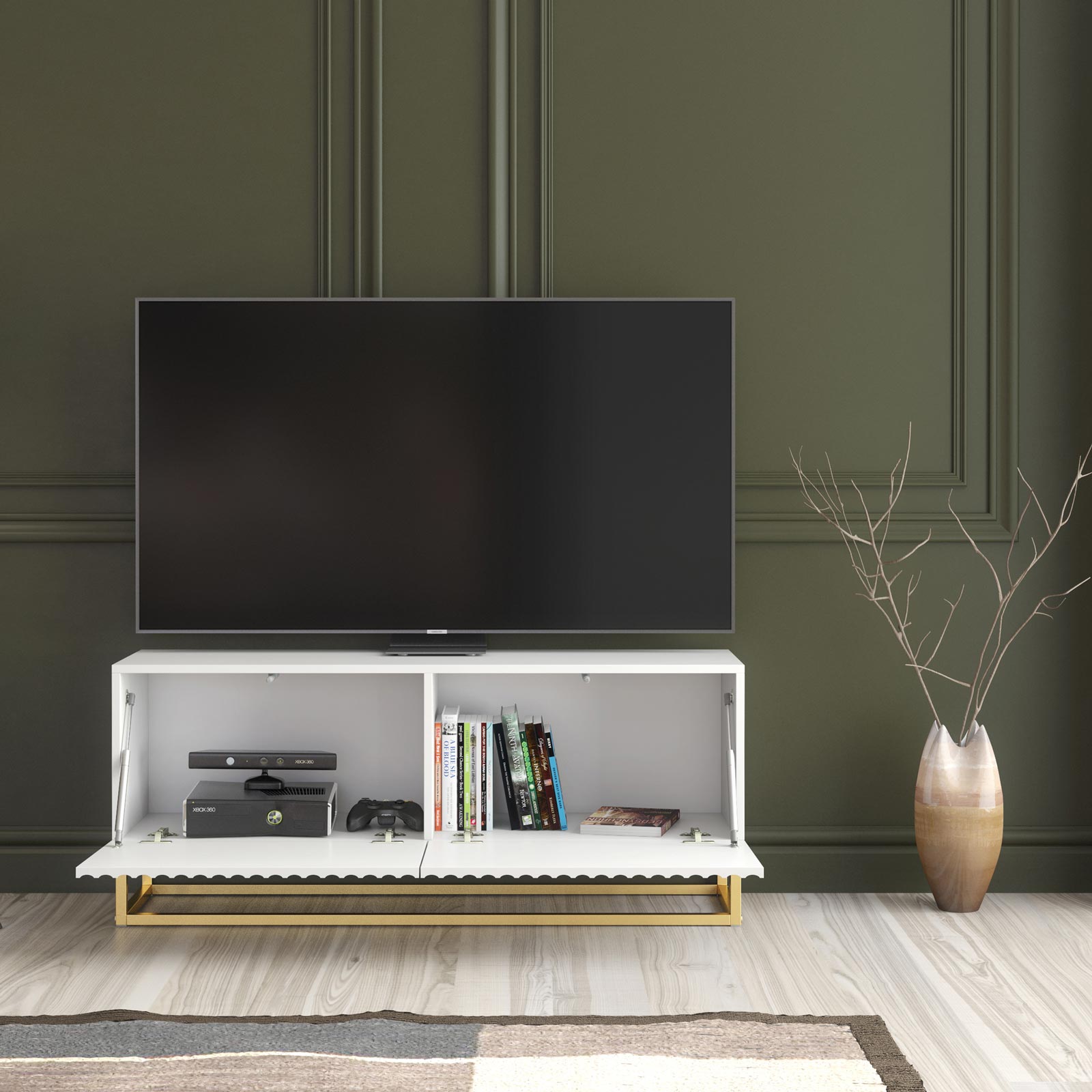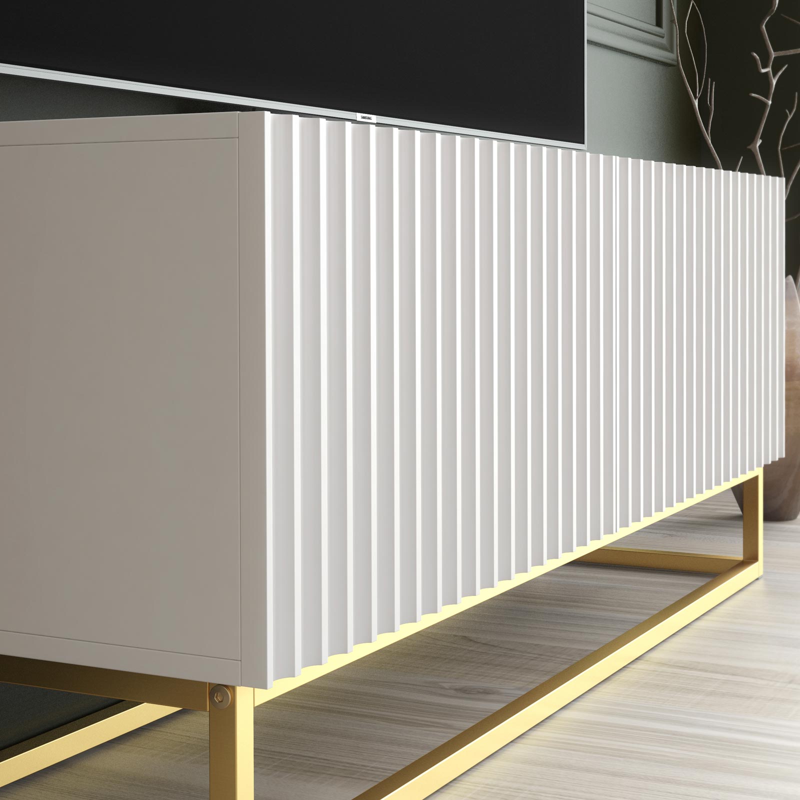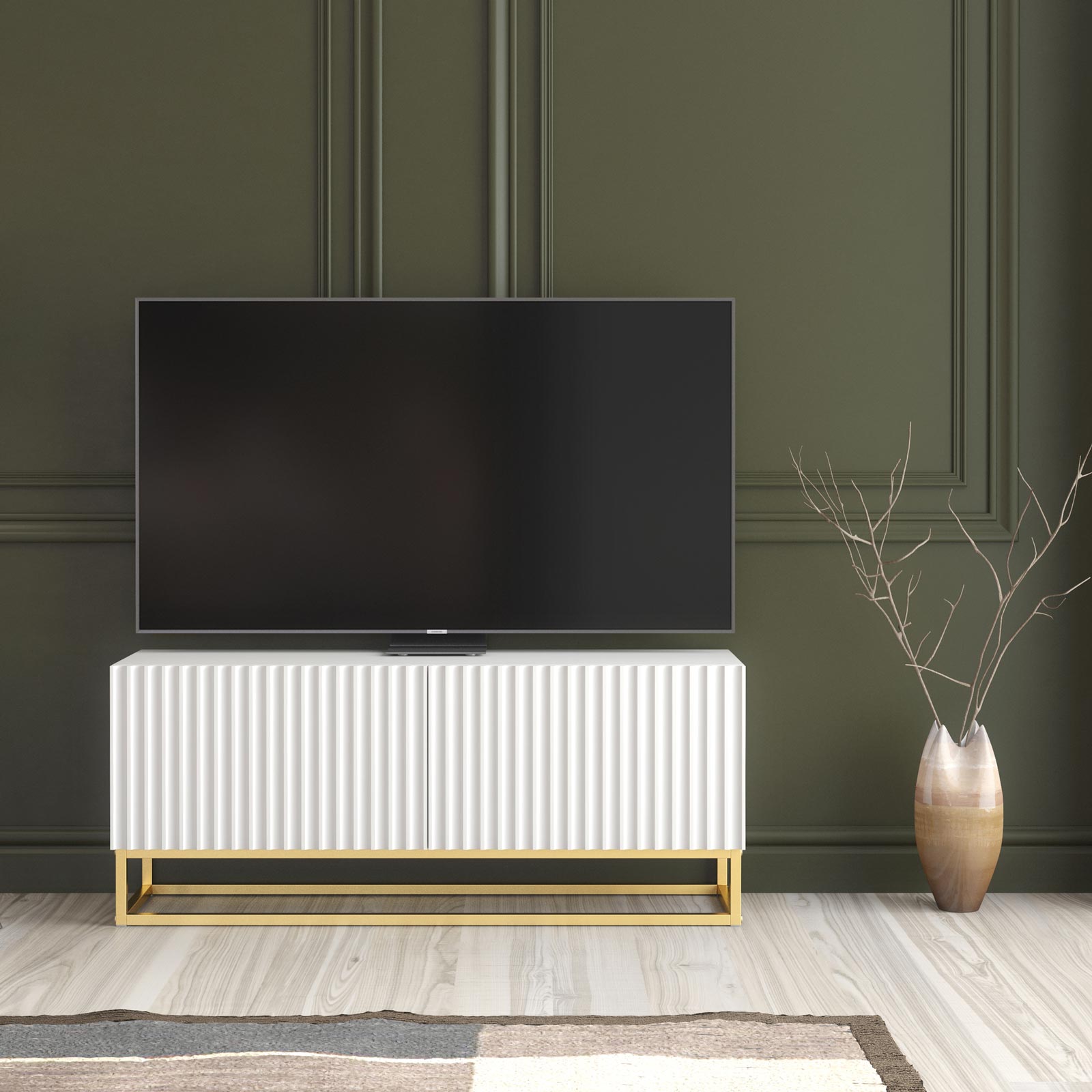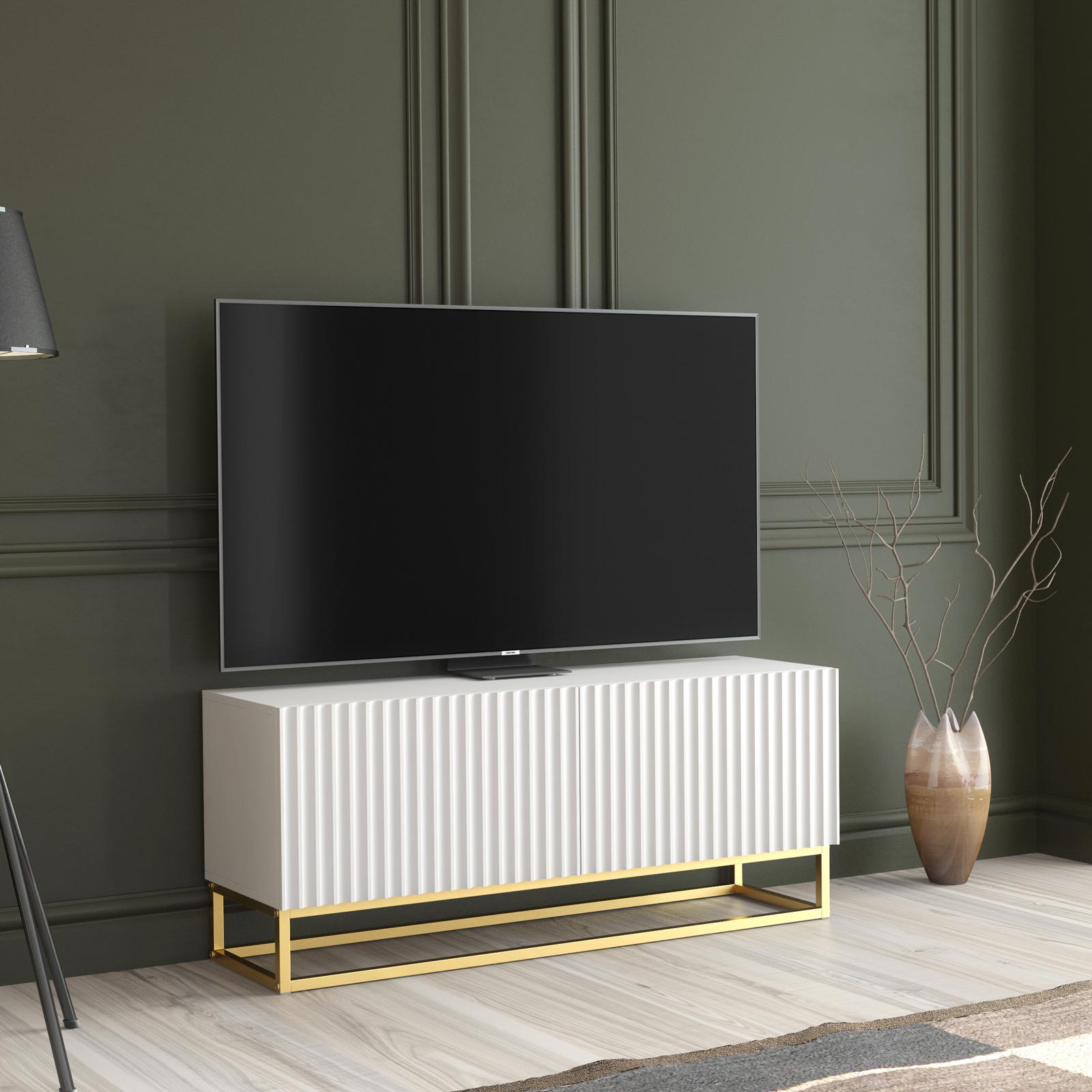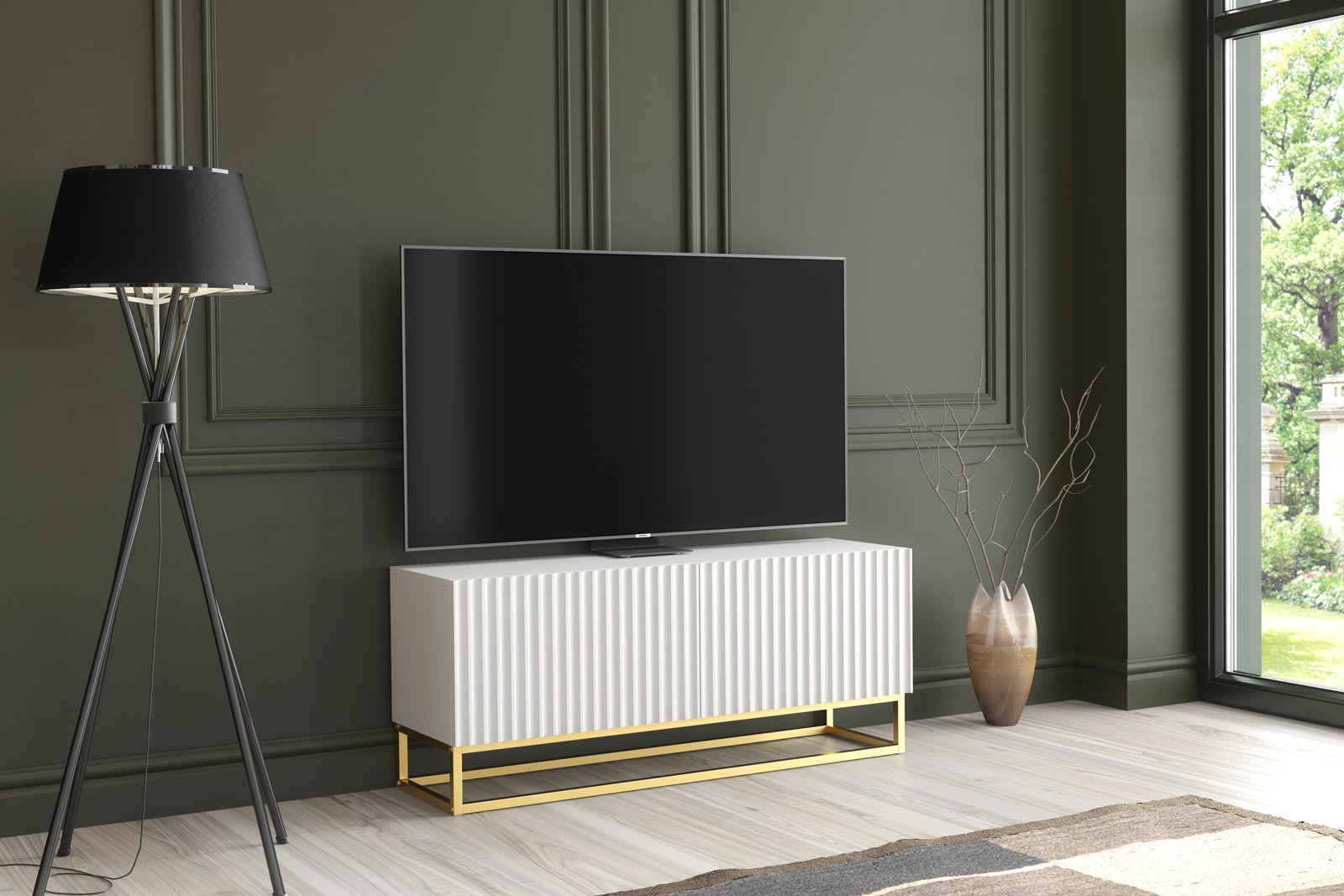 Create a refined contemporary look with this 100cm White Matt TV Unit, designed with elegant ribbed fronts and a striking gold metal base for a luxurious modern statement.
